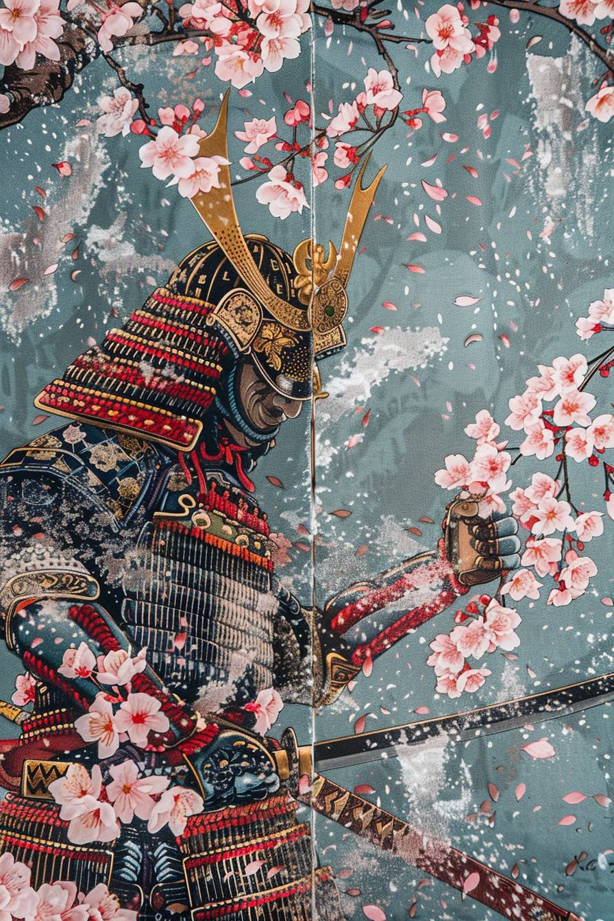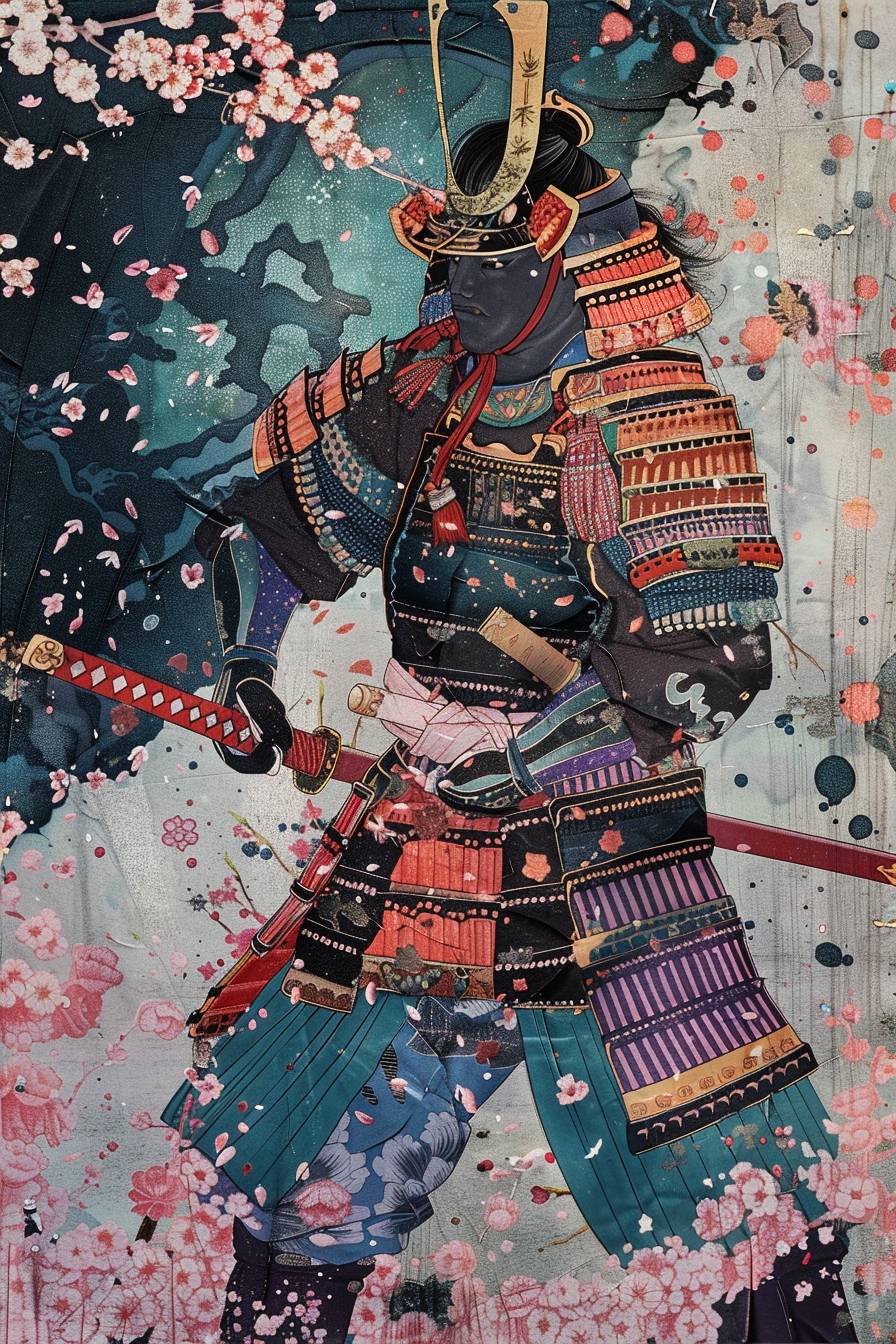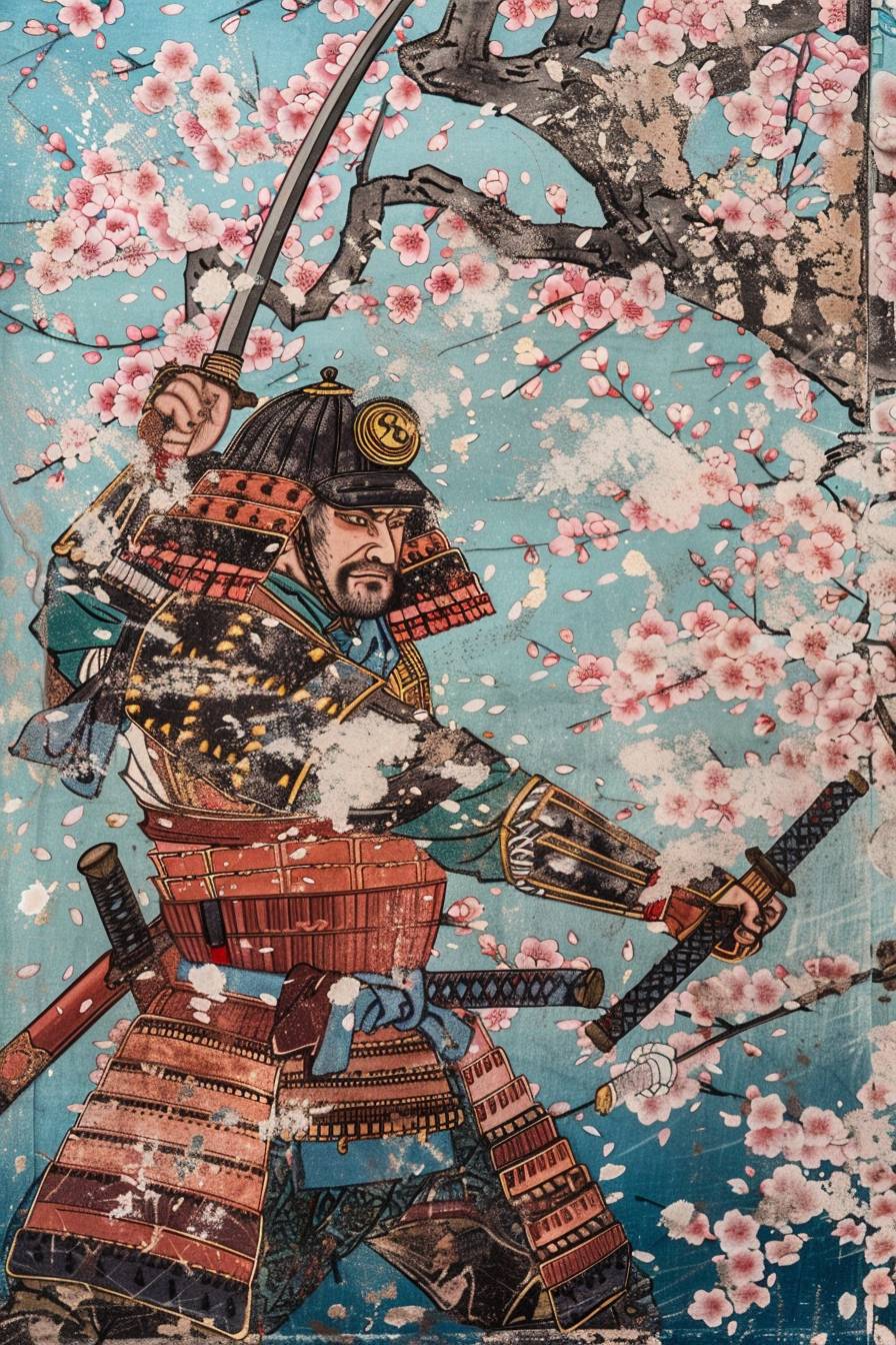 in style of Kunisada,Samurai warrior training in a cherry blossom garden --ar 2:3 --v 6.0
