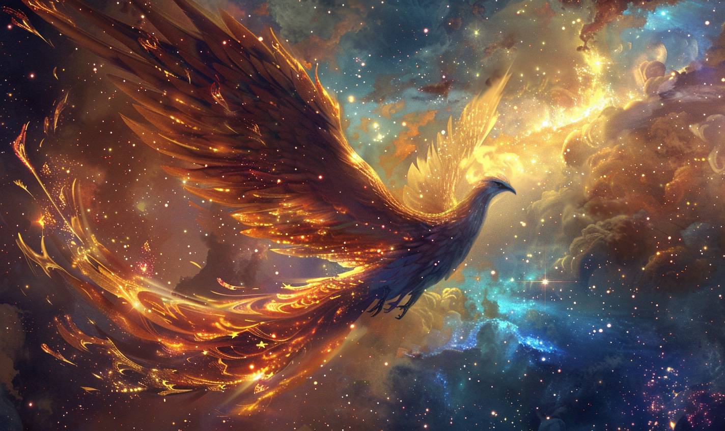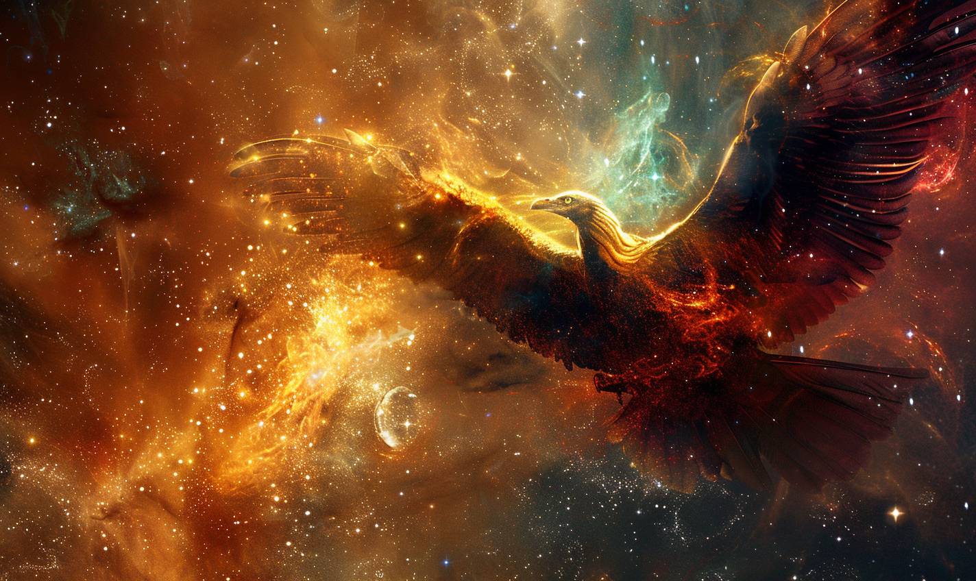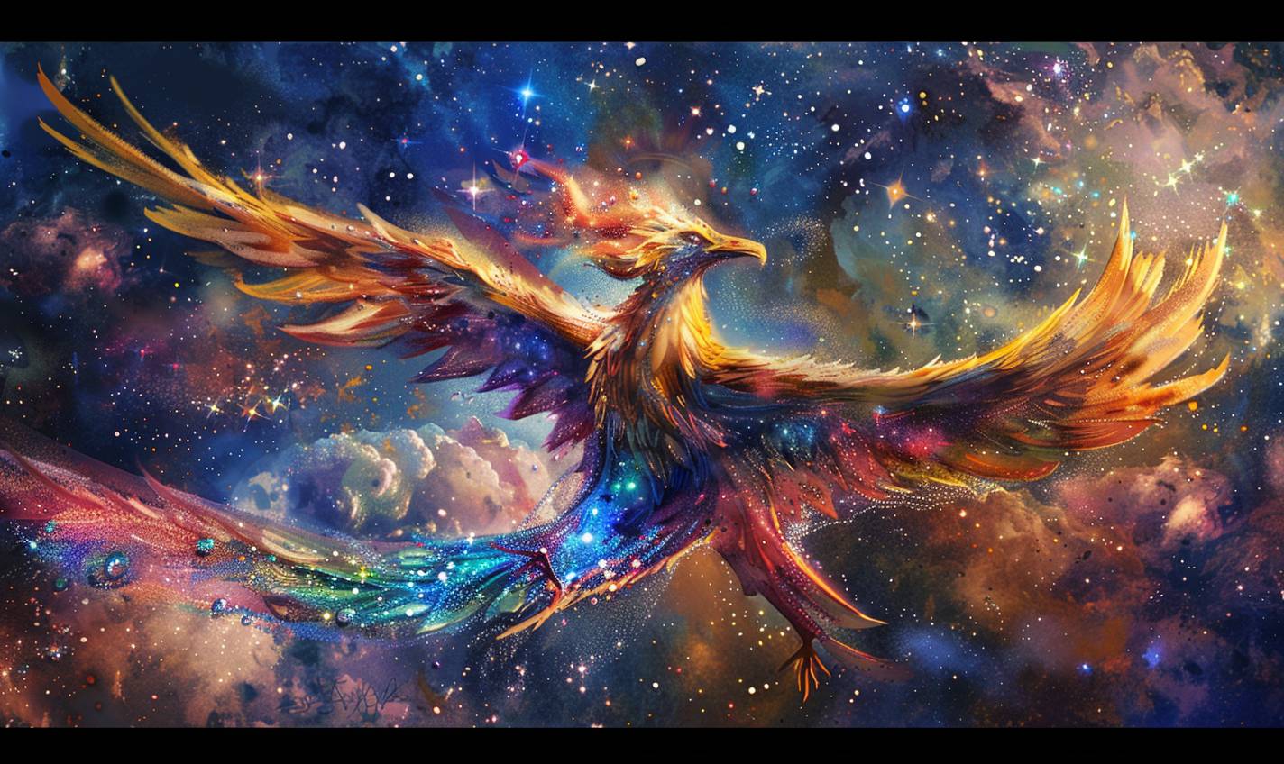 in style of Beatrix Potter,Cosmic phoenix soaring through the galaxy --ar 5:3 --v 6.0
