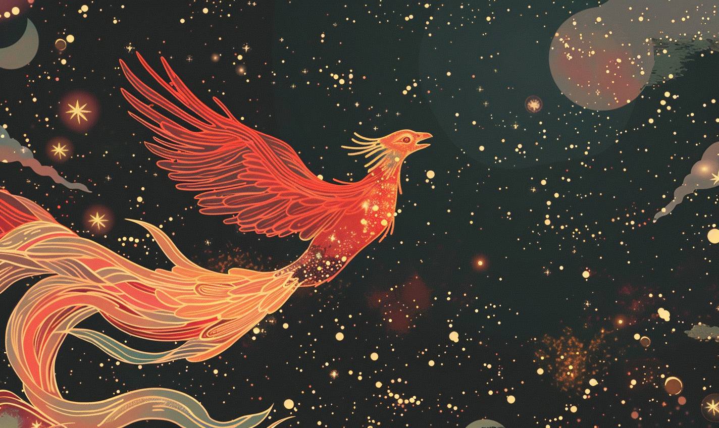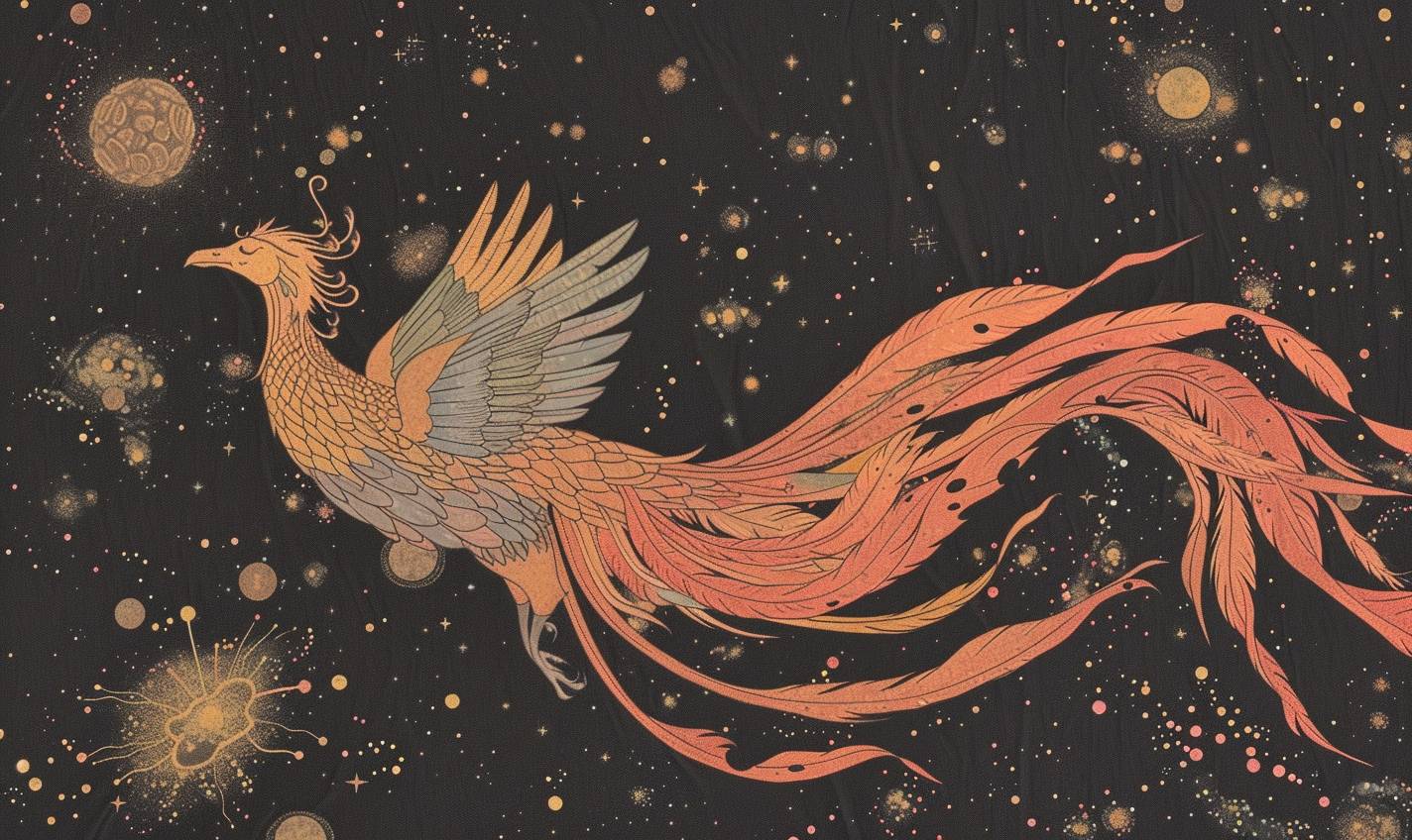 在哈丽特·李-梅里昂的风格中,宇宙凤凰在宇宙中滑翔。