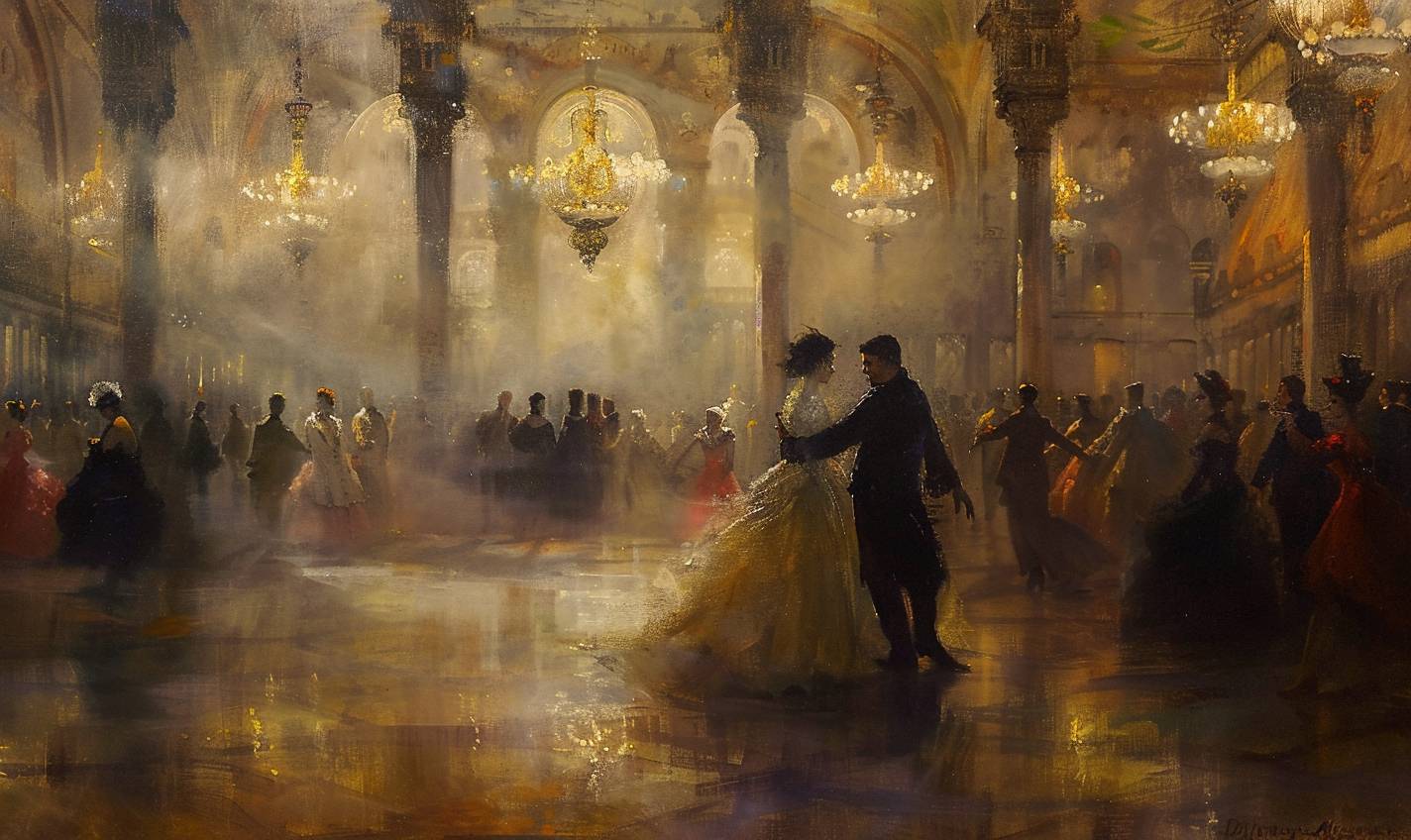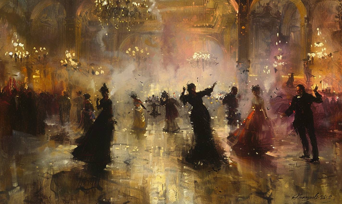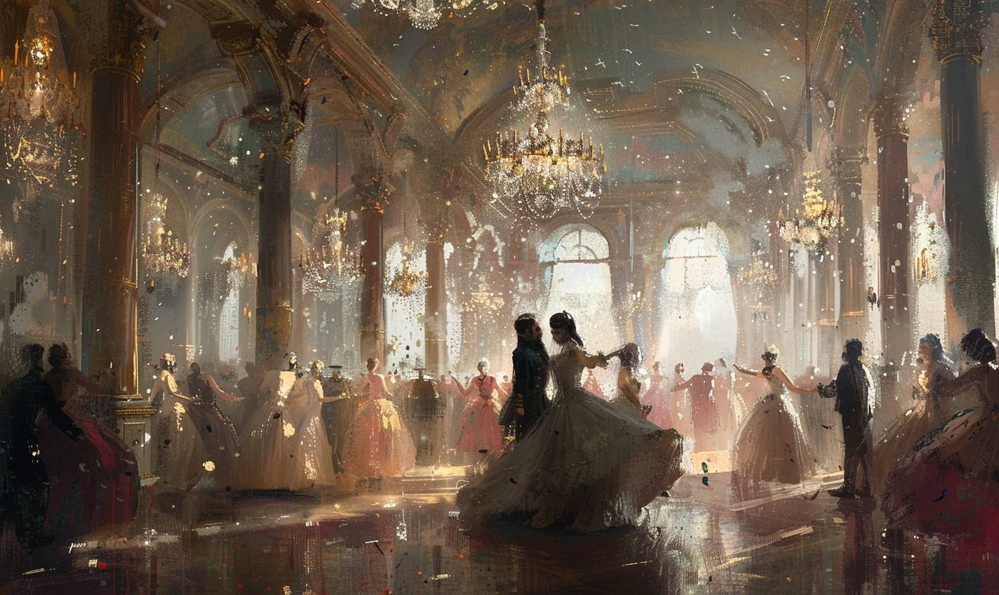 in style of Eugene Galien-Laloue,Ethereal ballroom with masked dancers --ar 5:3 --v 6.0