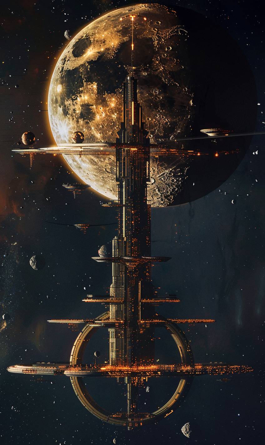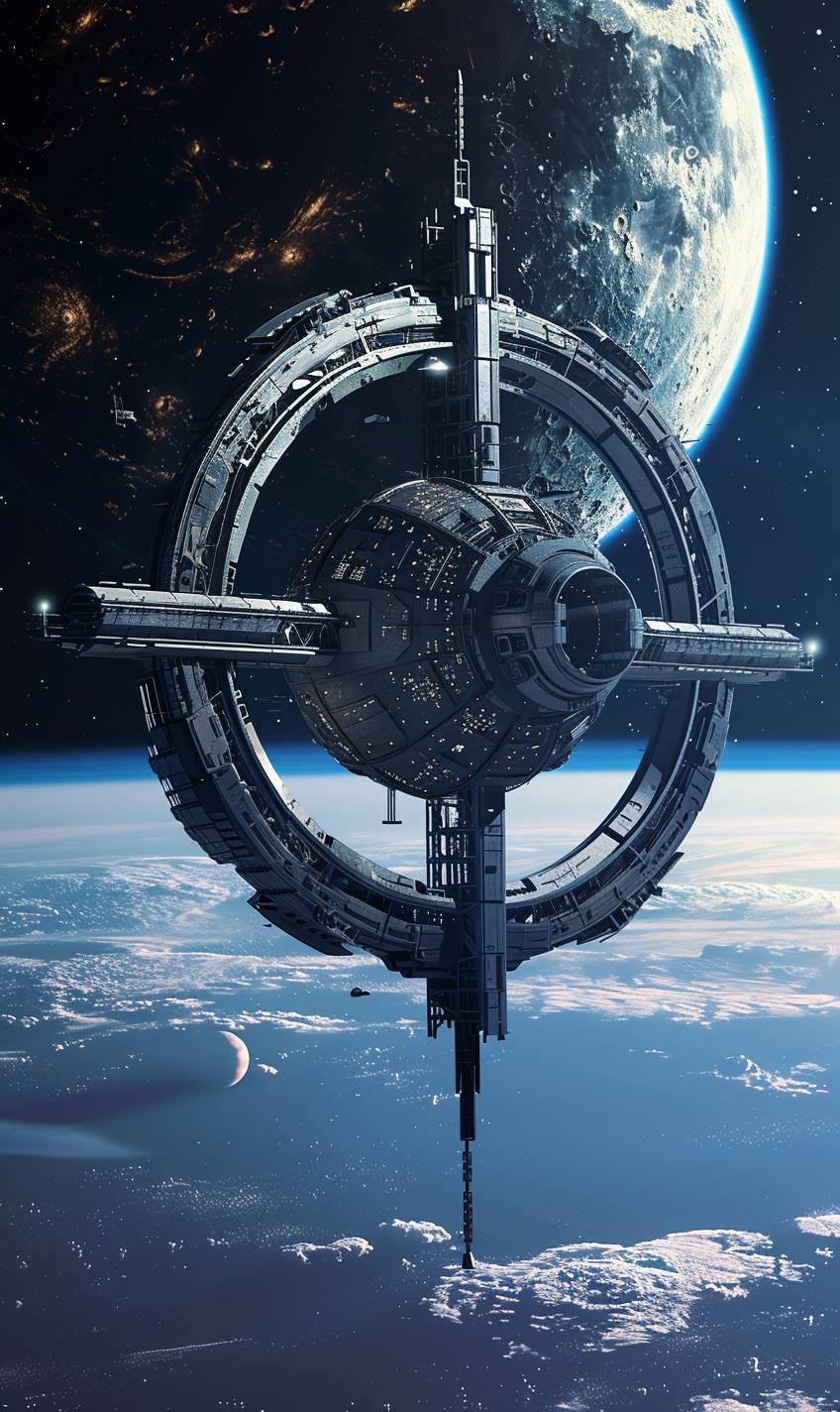以圣地亚哥·卡拉特拉瓦的风格设计的太空站,环绕遥远的月球