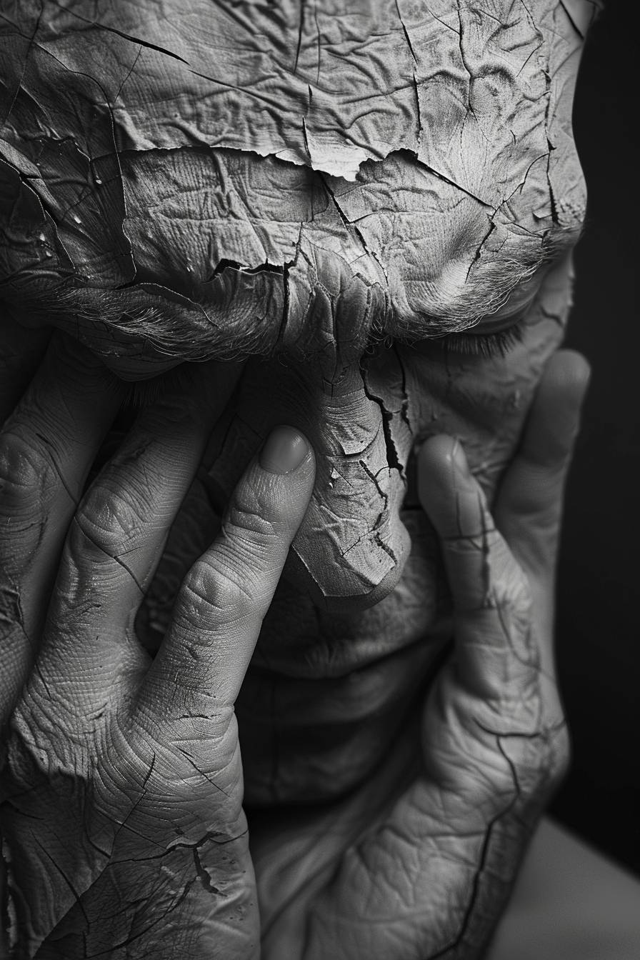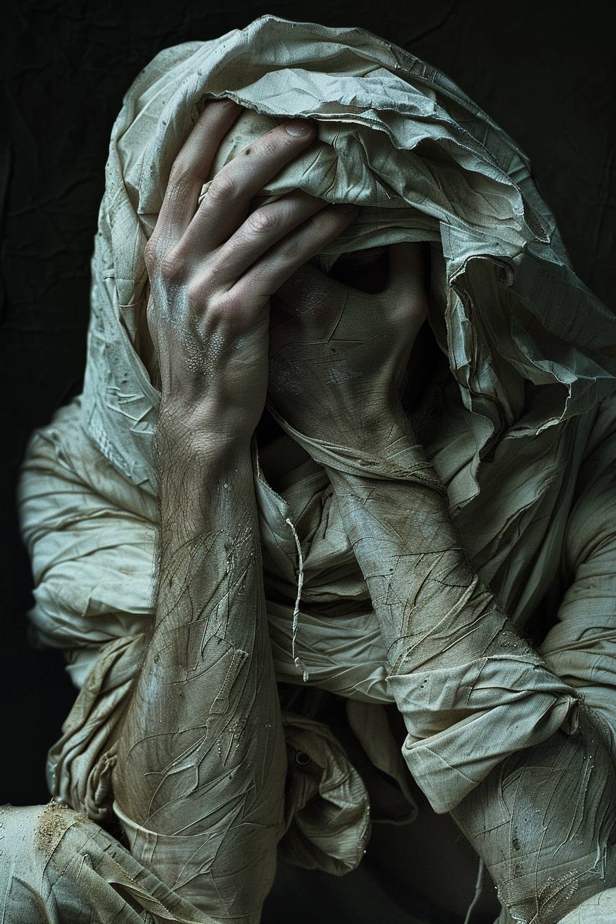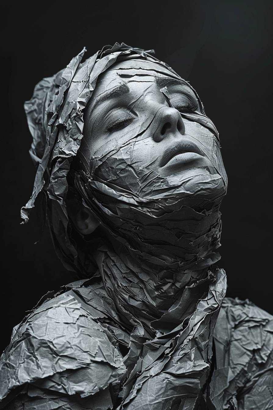 褶皱、皱纹,采用戏剧性光影效果的风格,后期处理,超现实的姿势