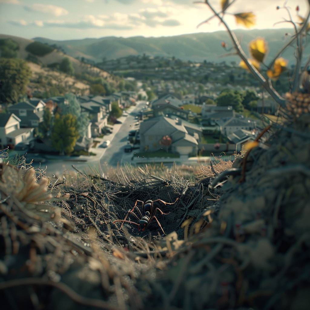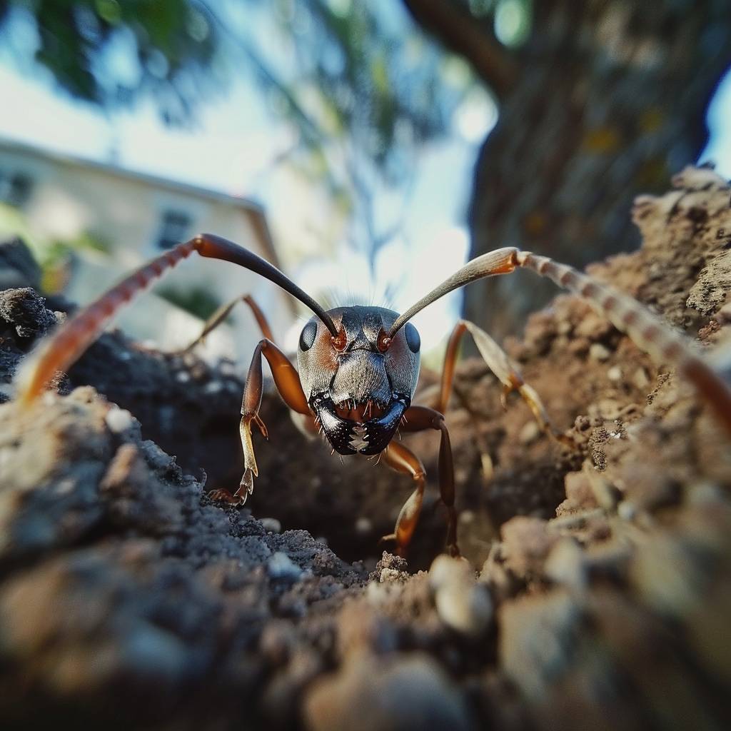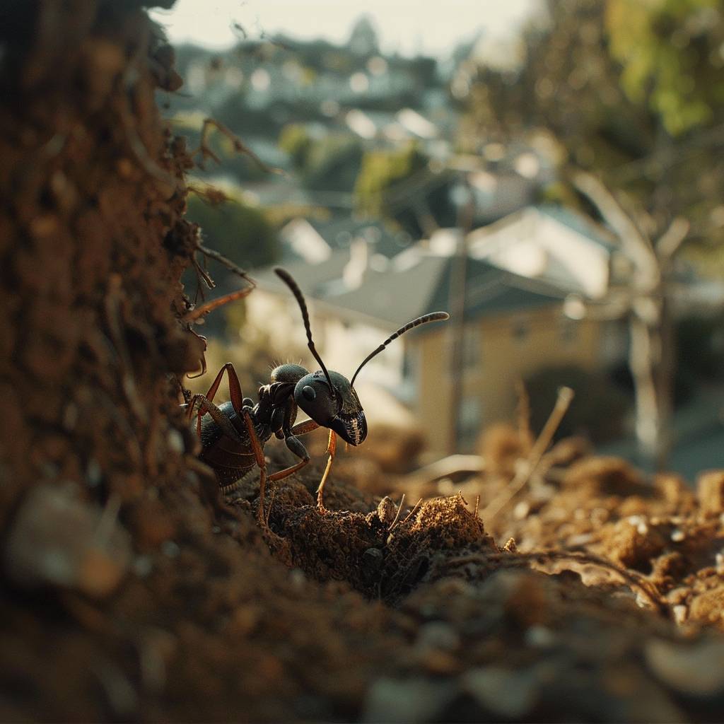 An extreme close-up shot of an ant emerging from its nest. The camera pulls back revealing a neighborhood beyond the hill. --v 6.0