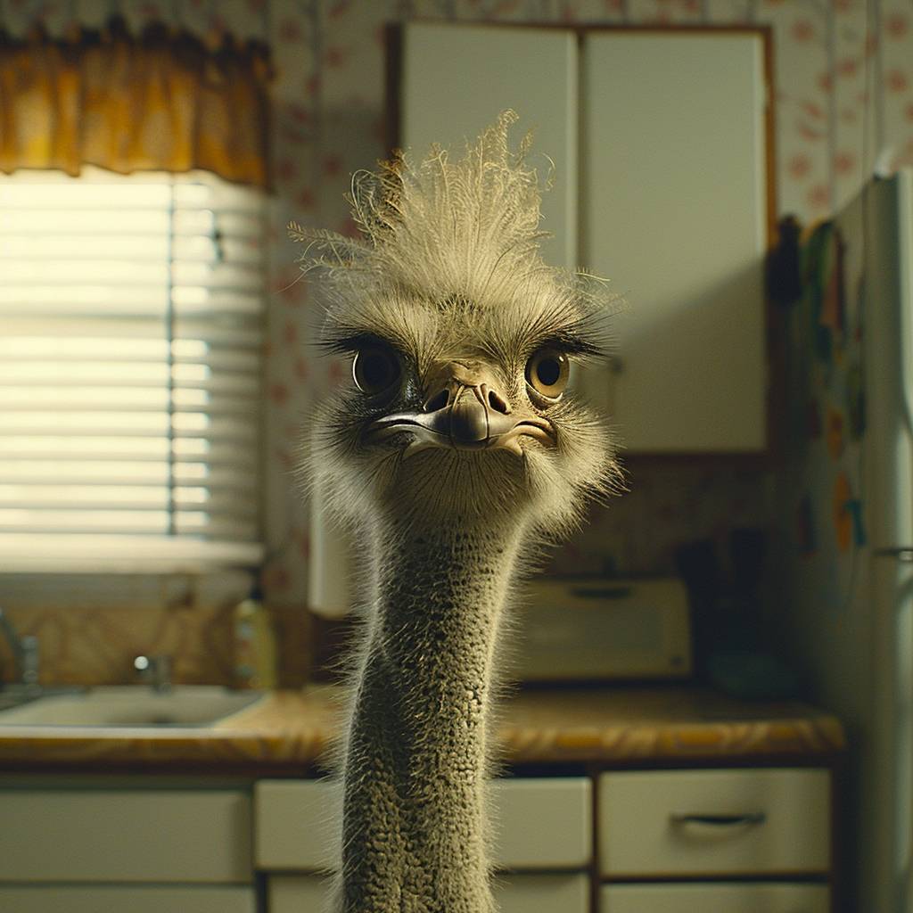 A slow cinematic push in on an ostrich standing in a 1980s kitchen. --v 6.0