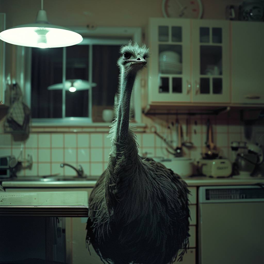 镜头缓慢推进,聚焦于一只站在1980年代厨房里的鸵鸟。