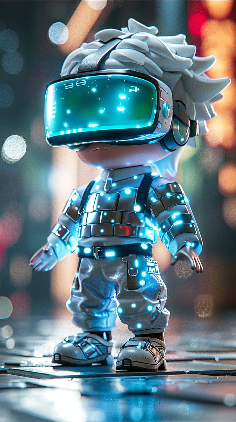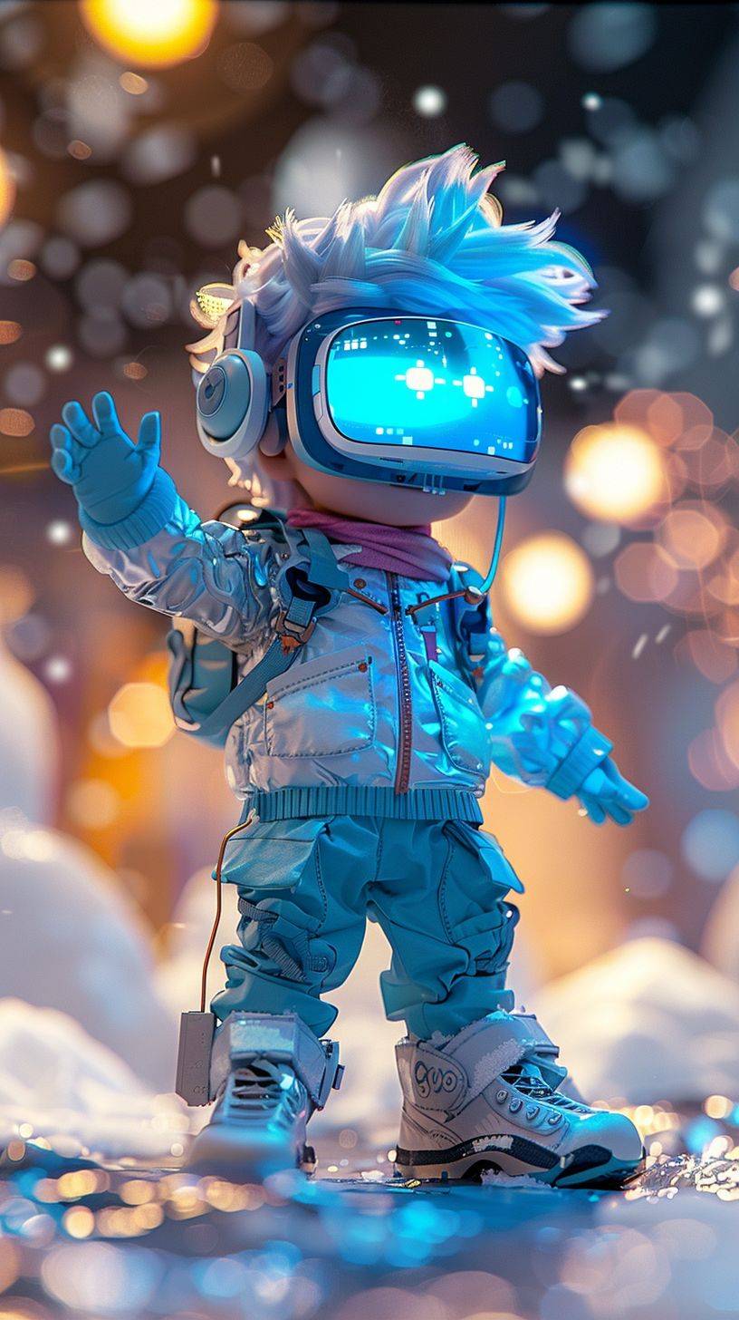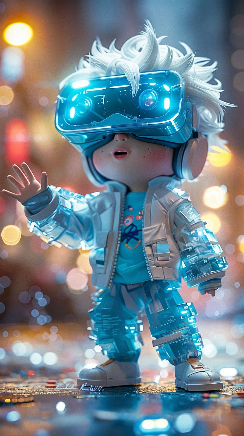 时尚玩具设计,成熟男孩戴着VR眼镜,微笑并朝虚拟世界伸手,穿着精致的银白色发光外套,搭配高端的浅蓝色自然色调,细节丰富,充满色彩的角色设计。
