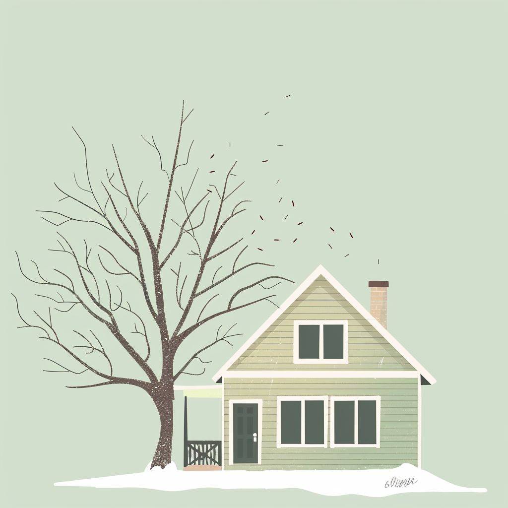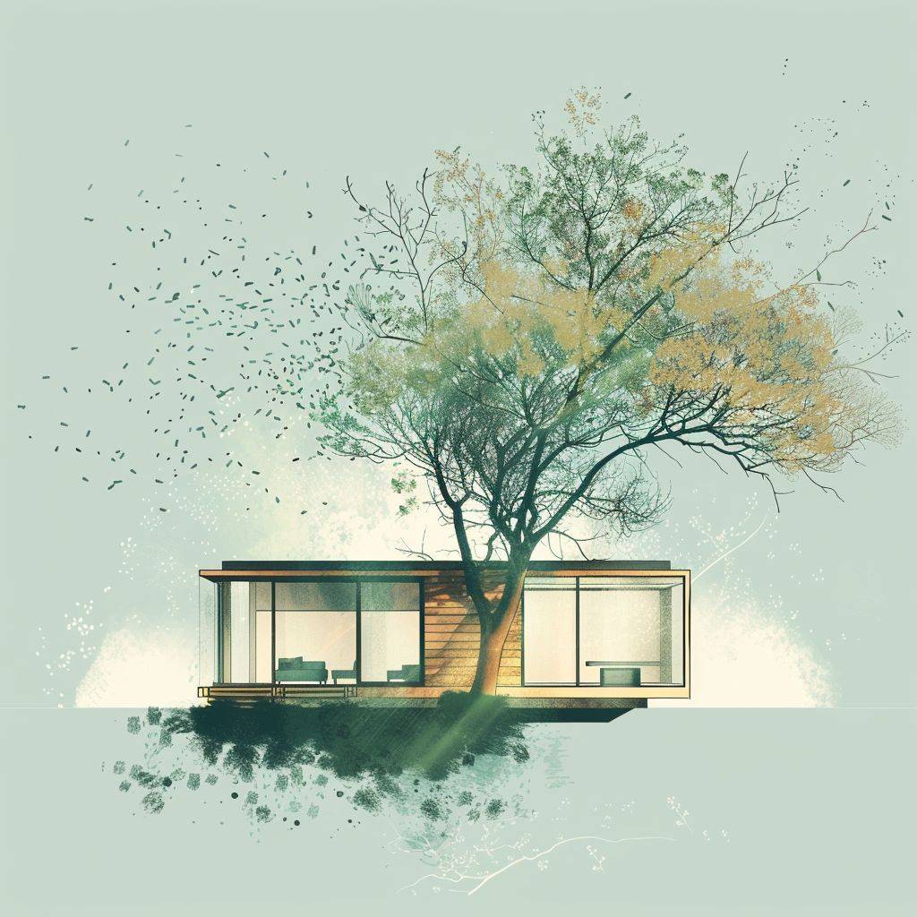 A cabin house , a tree have scattered branches behind it,minimalist illustration style ,green macaron color scheme,32kHD