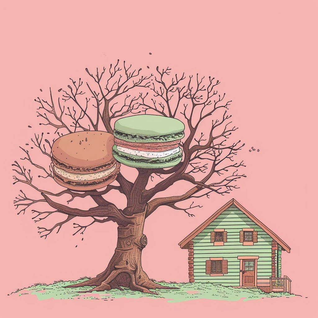 一座小木屋,后面有一棵散落枝叶的树,极简插图风格,绿色马卡龙色调,32k高清