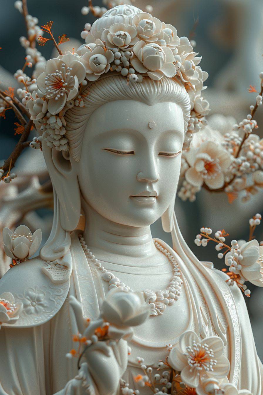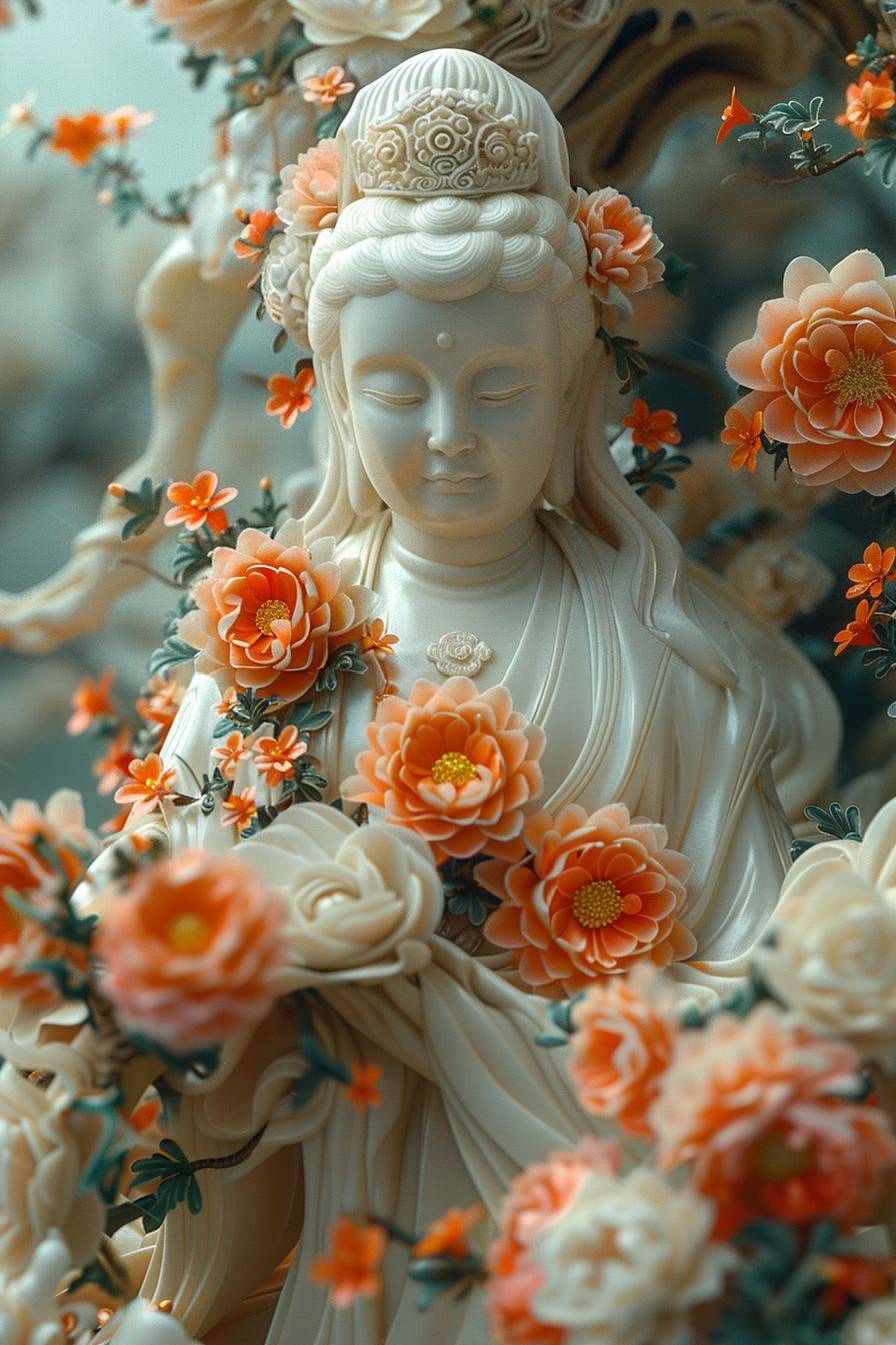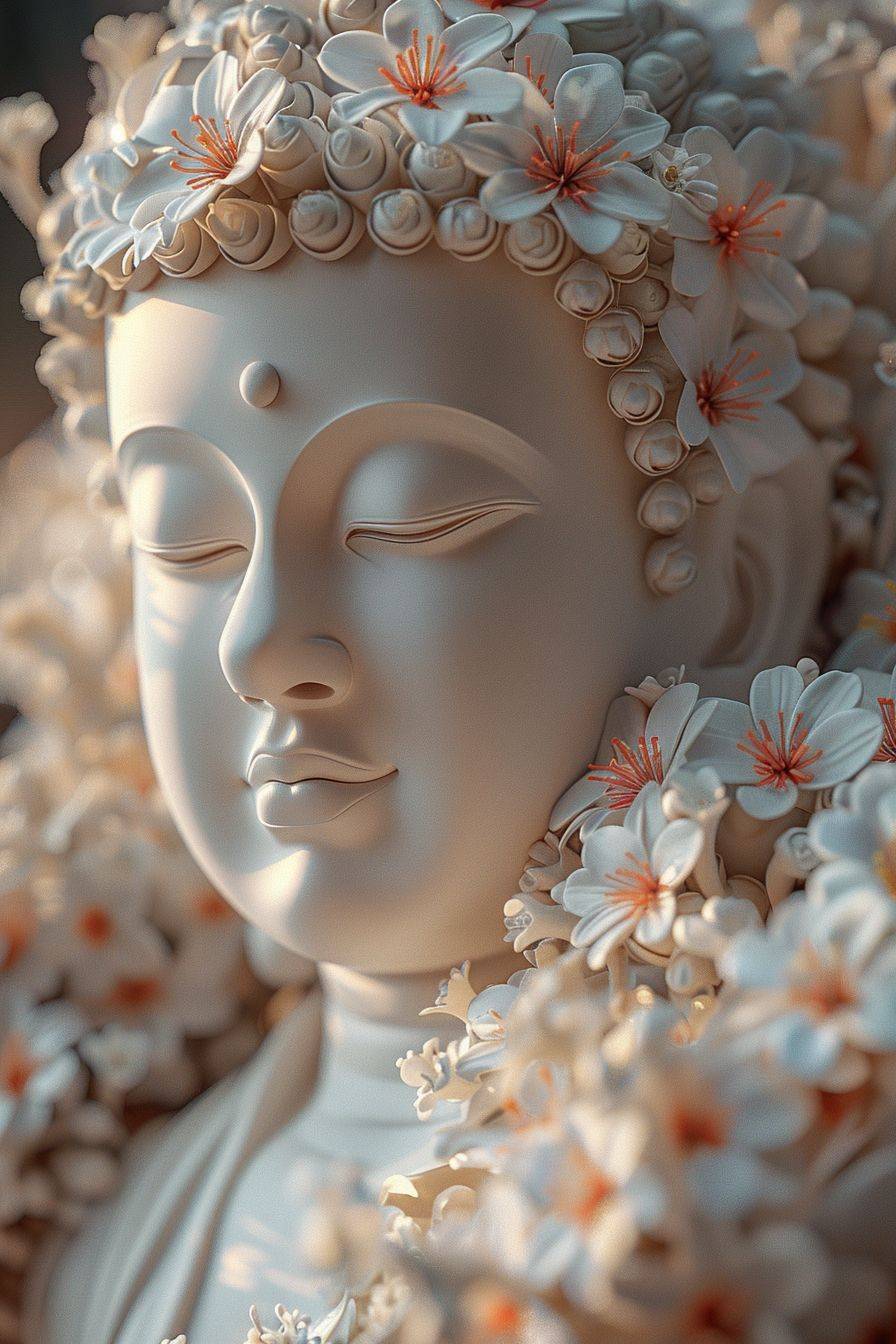 a beautiful white buddha with flowers, in the style of macro zoom, daz3d, dark beige, hd, carving--chaos 20 --style raw --ar 2:3 --stylize 1000