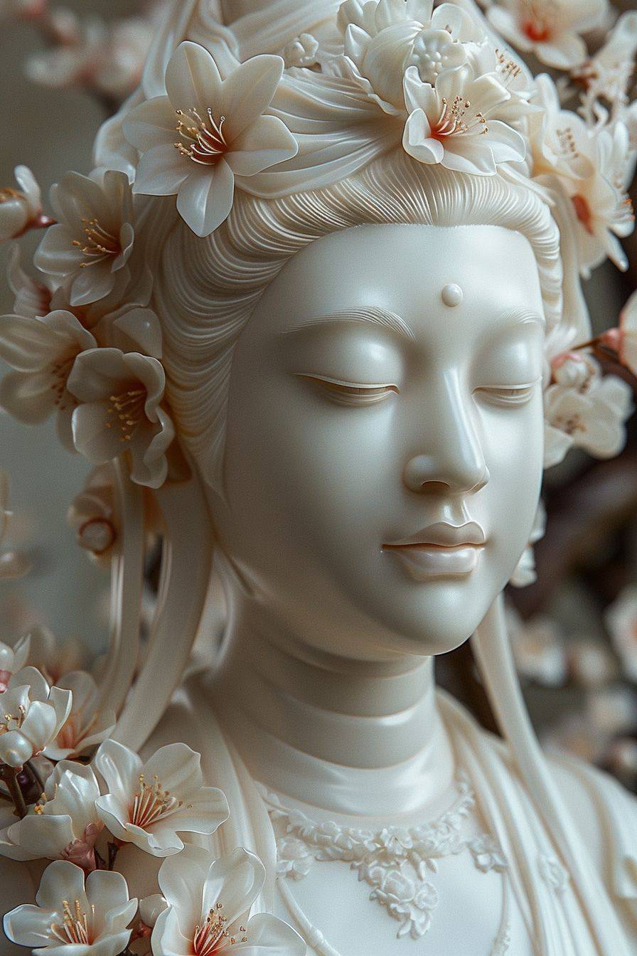 一尊美丽的白色佛像,伴随着鲜花,采用宏观特写风格,深米色,高清,雕刻