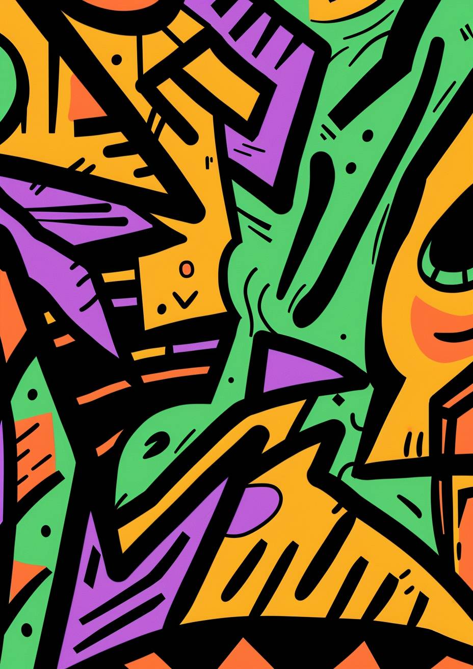 以绿色背景配合鲜艳的橙、黑、紫线条艺术作品。