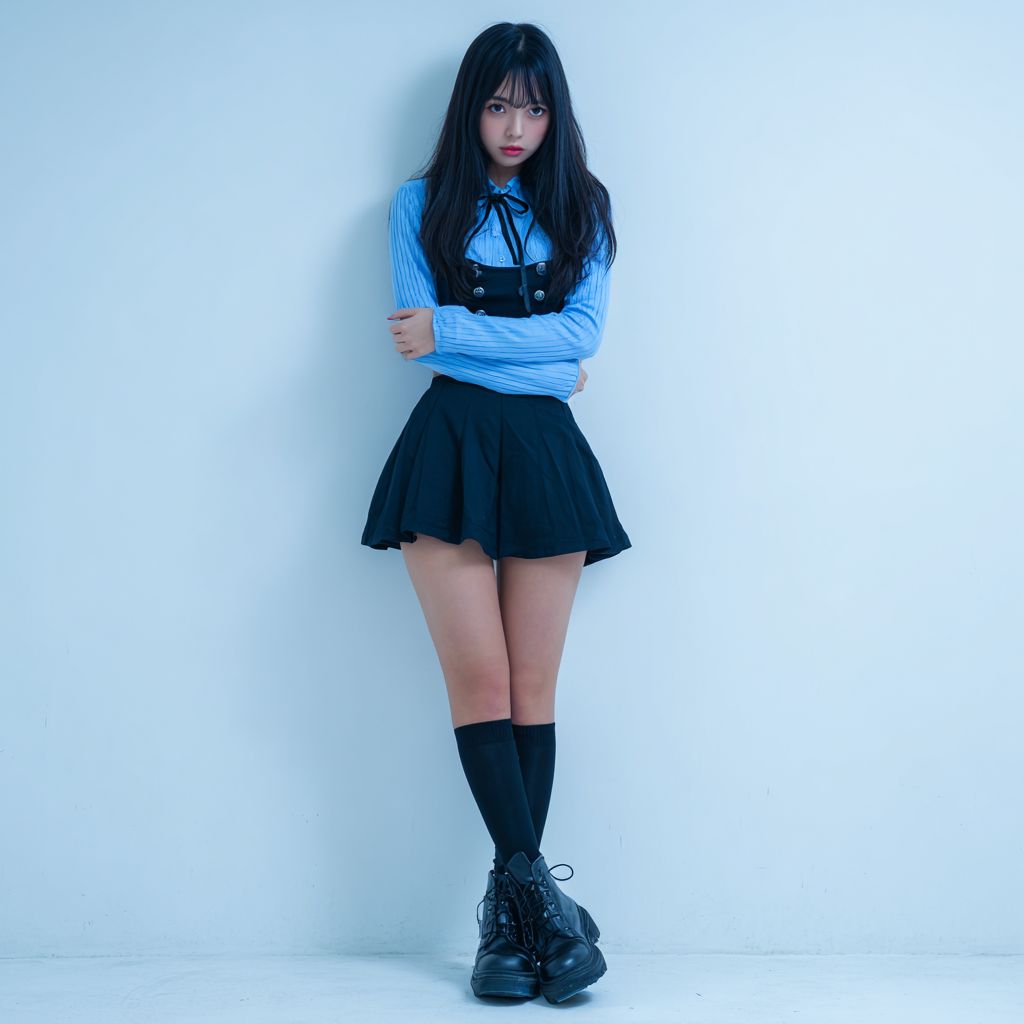 一个年轻的日本女孩,像是流行音乐组合,穿着蓝色短裙服装,黑色长发,背景是简约的白色工作室。