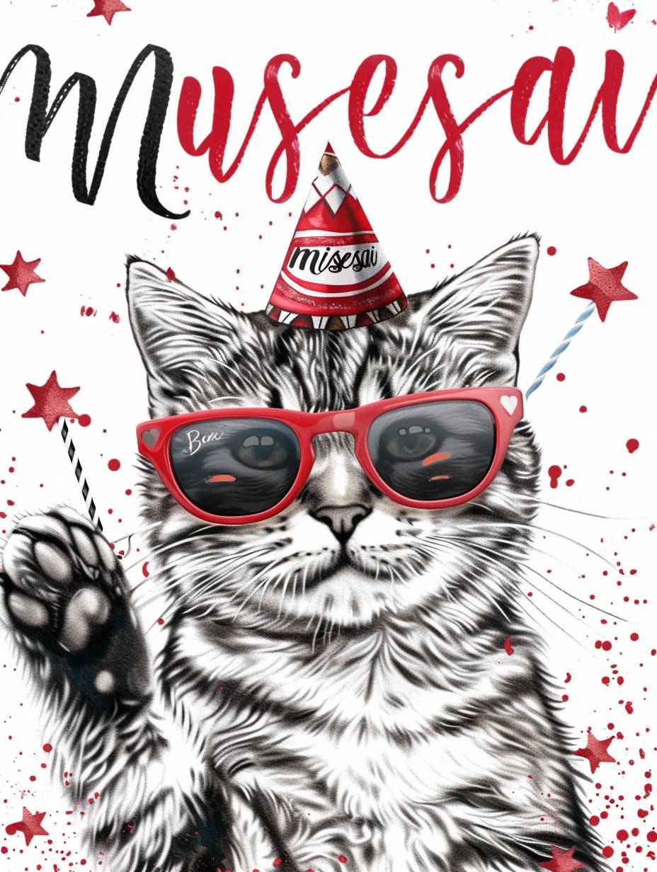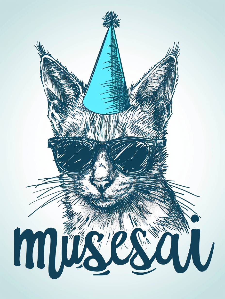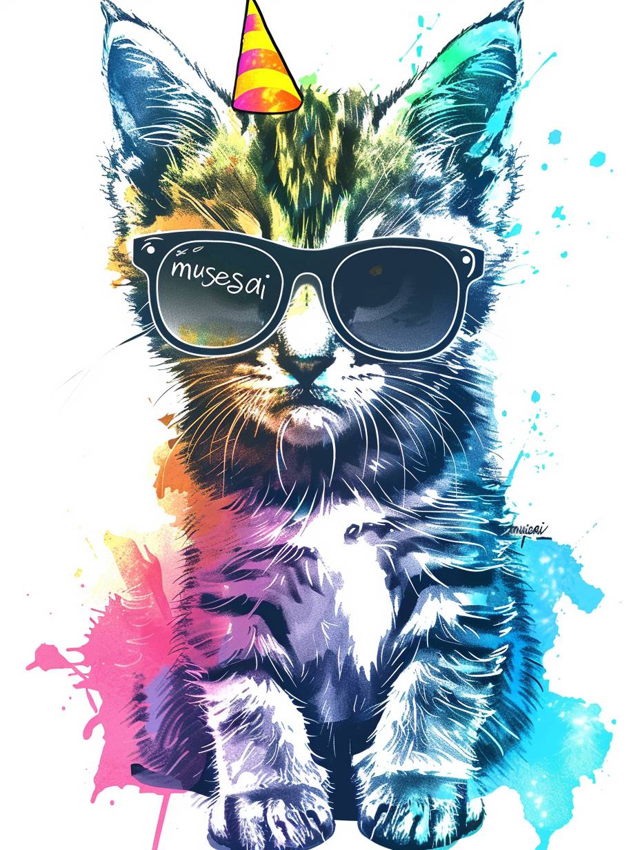 A minimalist birthday card featuring a pencil-sketched cat wearing colorful, oversized sunglasses and a tiny party hat. The background is clean and white, with the cat being the primary focus. The text reads "musesai" in a playful, handwritten font. The design should be humorous and whimsical, with the cat's accessories in vibrant watercolor tones to add a fun pop of color. --chaos 60 --ar 3:4 --stylize 200 --v 6.0