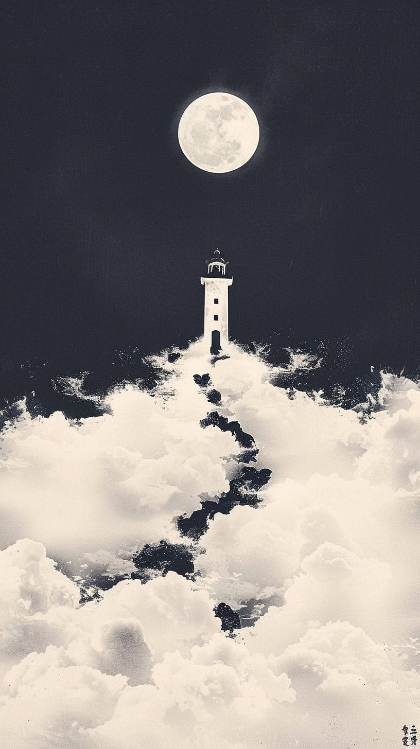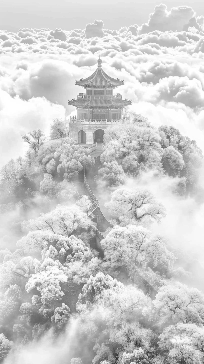 black and white photo of Distant Chinese temple emerging from the clouds stands out in the moonlight against a black background, seen from above, pictorialism --ar 9:16 --style raw --p b1oftln --s 1000 --v 6.0