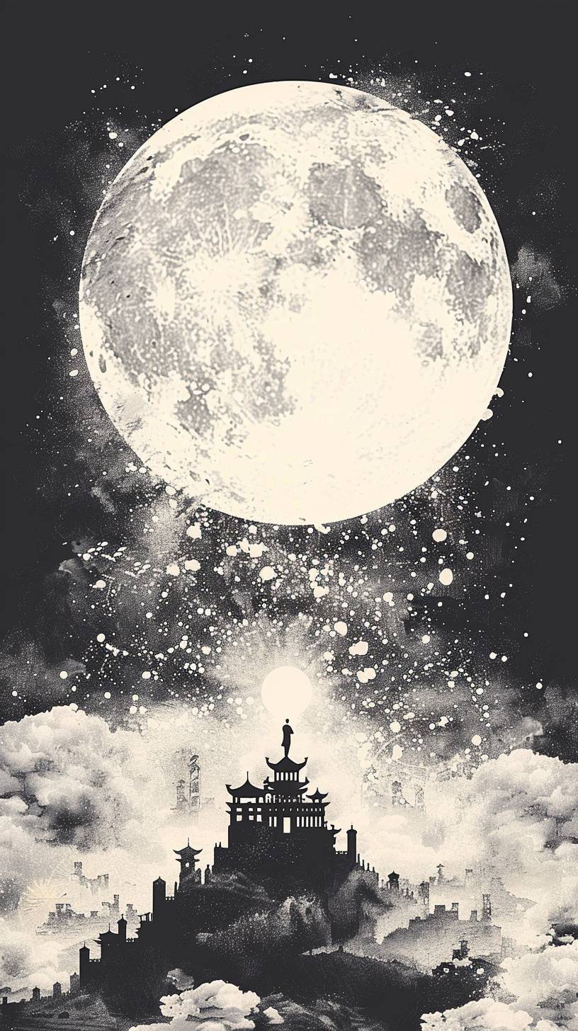 朦胧的月光下,远处的中国寺庙从云中浮现,黑色背景上显得格外醒目,俯视视角,表现主义风格。