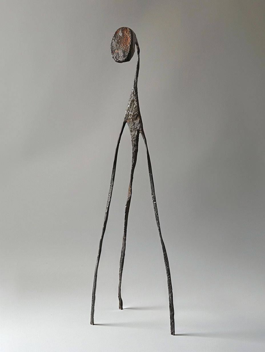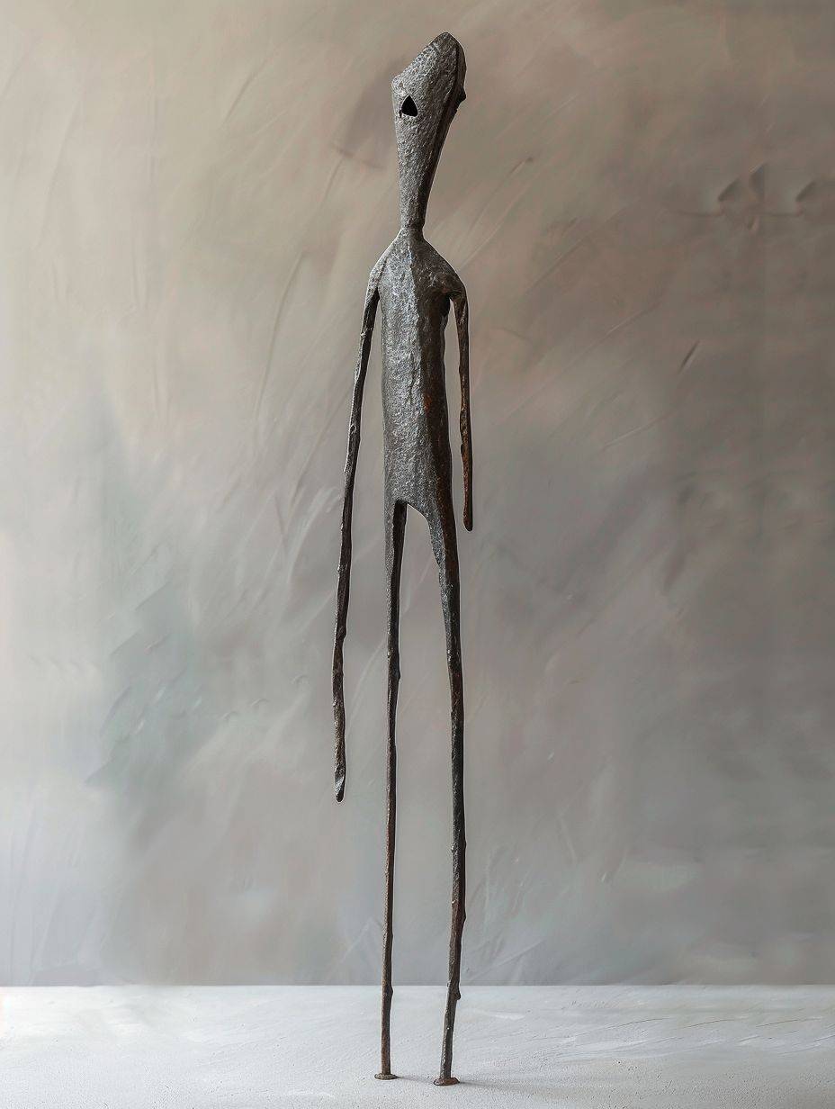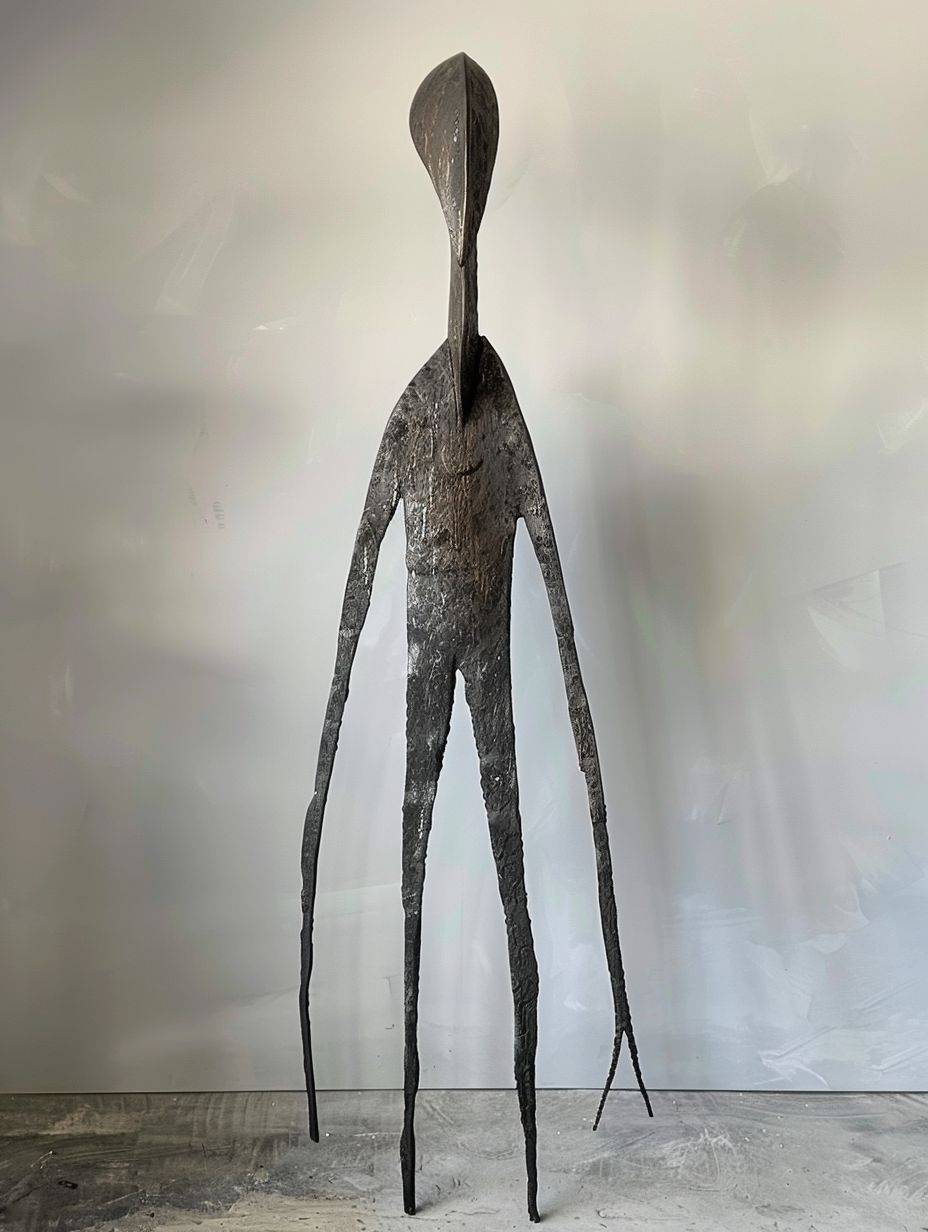 一件灵感来自新石器时代的简单钢铁雕塑,展示了一种奇特的高大人形/动物形态,具有长腿和抽象特征。