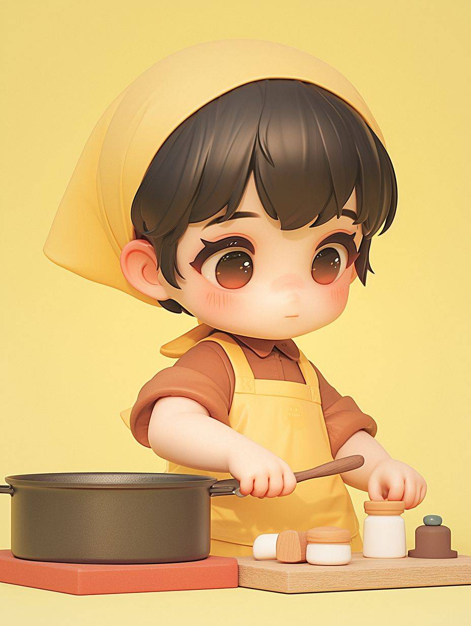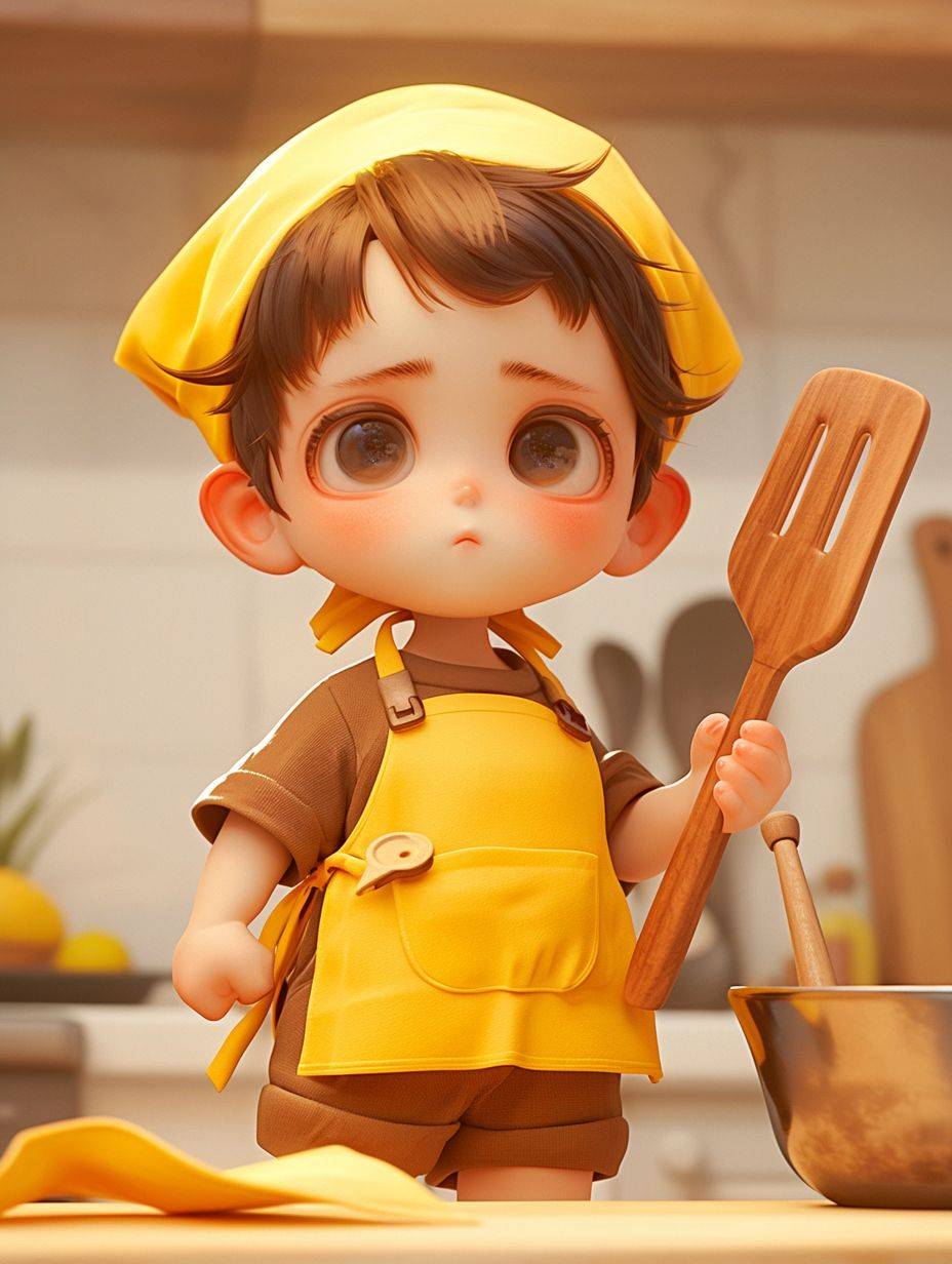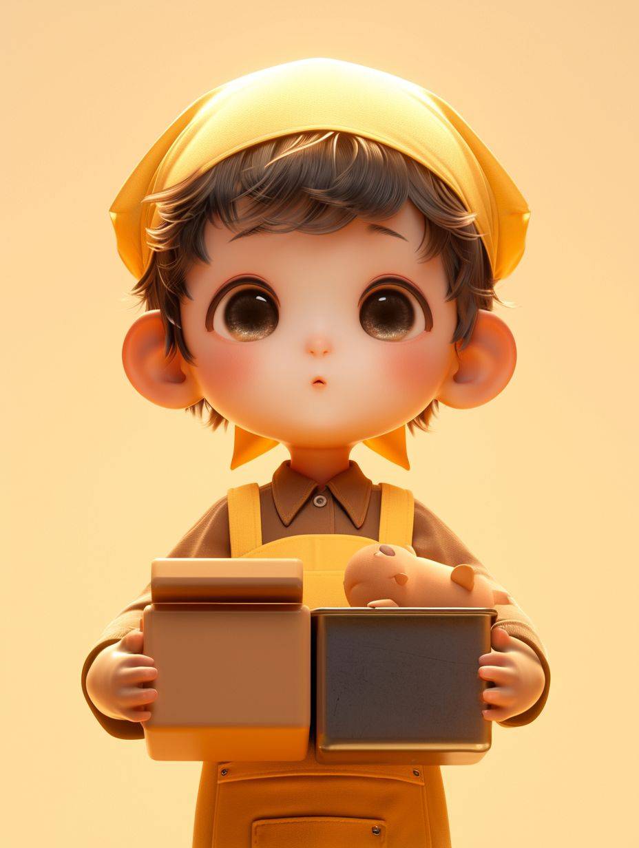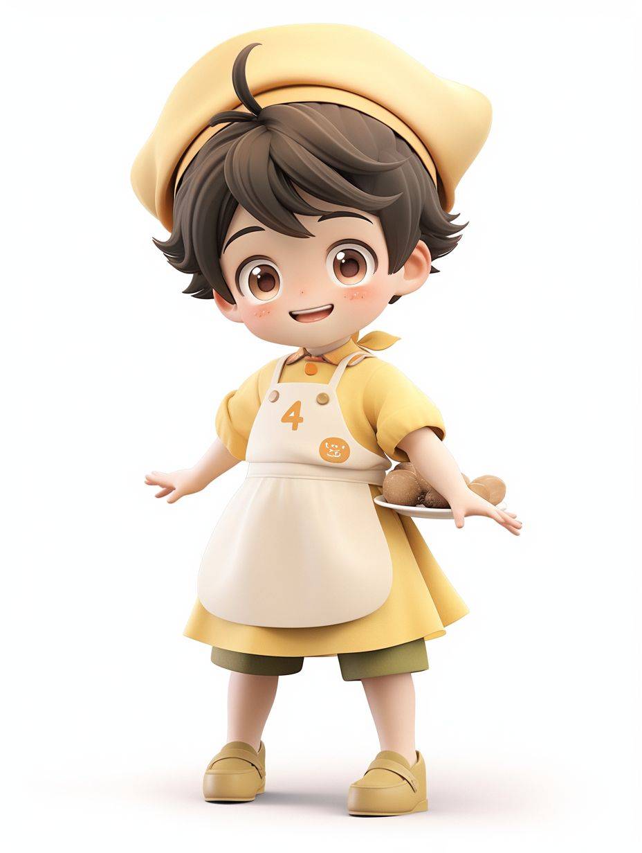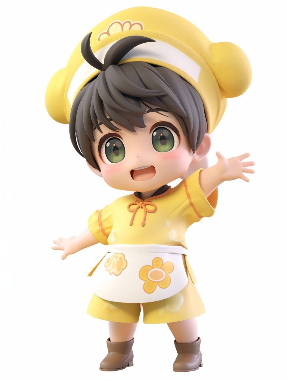 A cute 6 year old boy, brown clothes, yellow apron, yellow headband, four kinds of but tong, blind box style, looking at camera, pop market, octagonal rendering, super detailed edge lighting, chibi, black hair, C4D, shading, best quality, 16k, hd, white background --ar 3:4 --niji 6