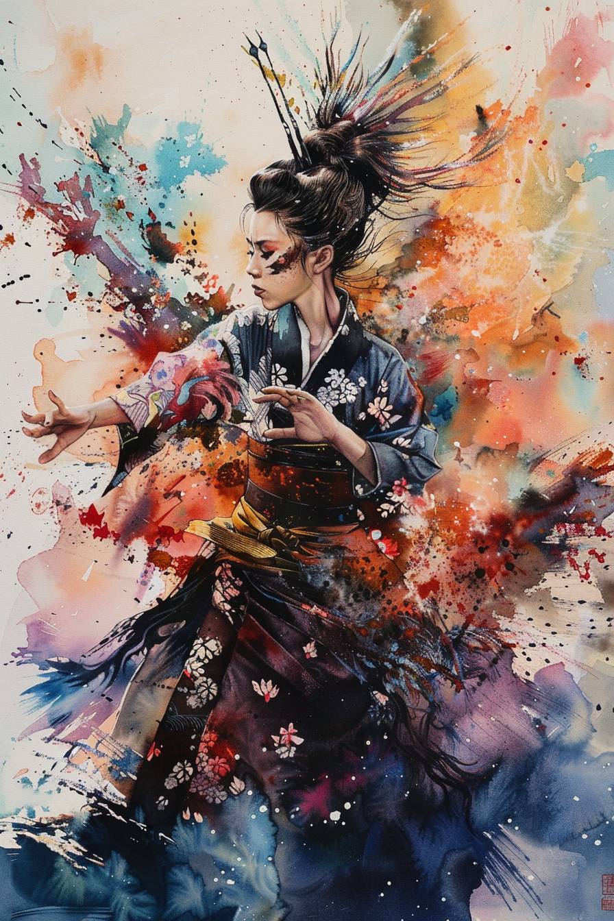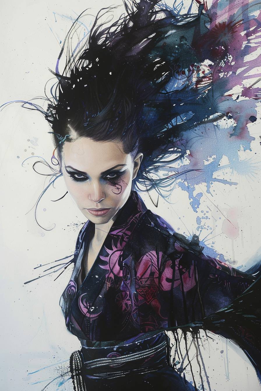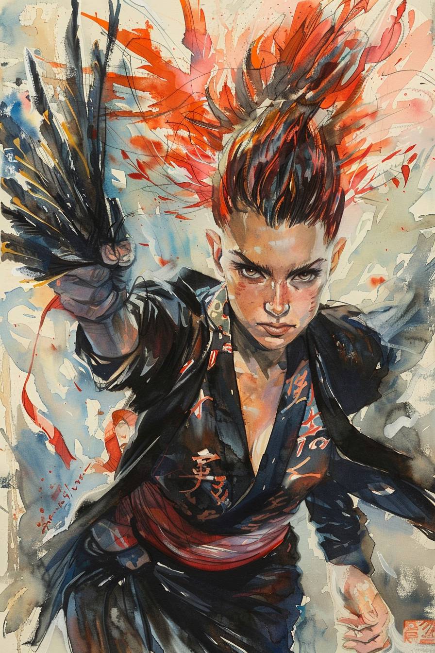 a sylph,kimono,Mohawk,random pose,wind effects,full of confidence,a willful glance,watercolor painting,It has a bewitching, energetic punk vibe,The overall atmosphere is intense and captivating, emphasizing her strong and mesmerizing presence --ar 2:3 --v 6.0