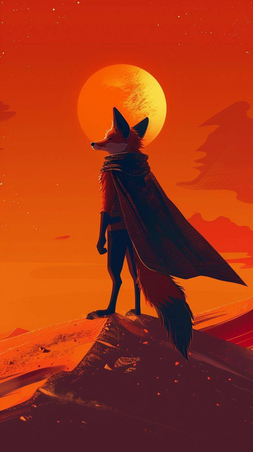 这是一个以Moebius风格描绘的拟人化狐狸角色,英勇地站在沙丘上,沐浴在发光的橙色天空下,灵感来源于《沙丘》的科幻美学。