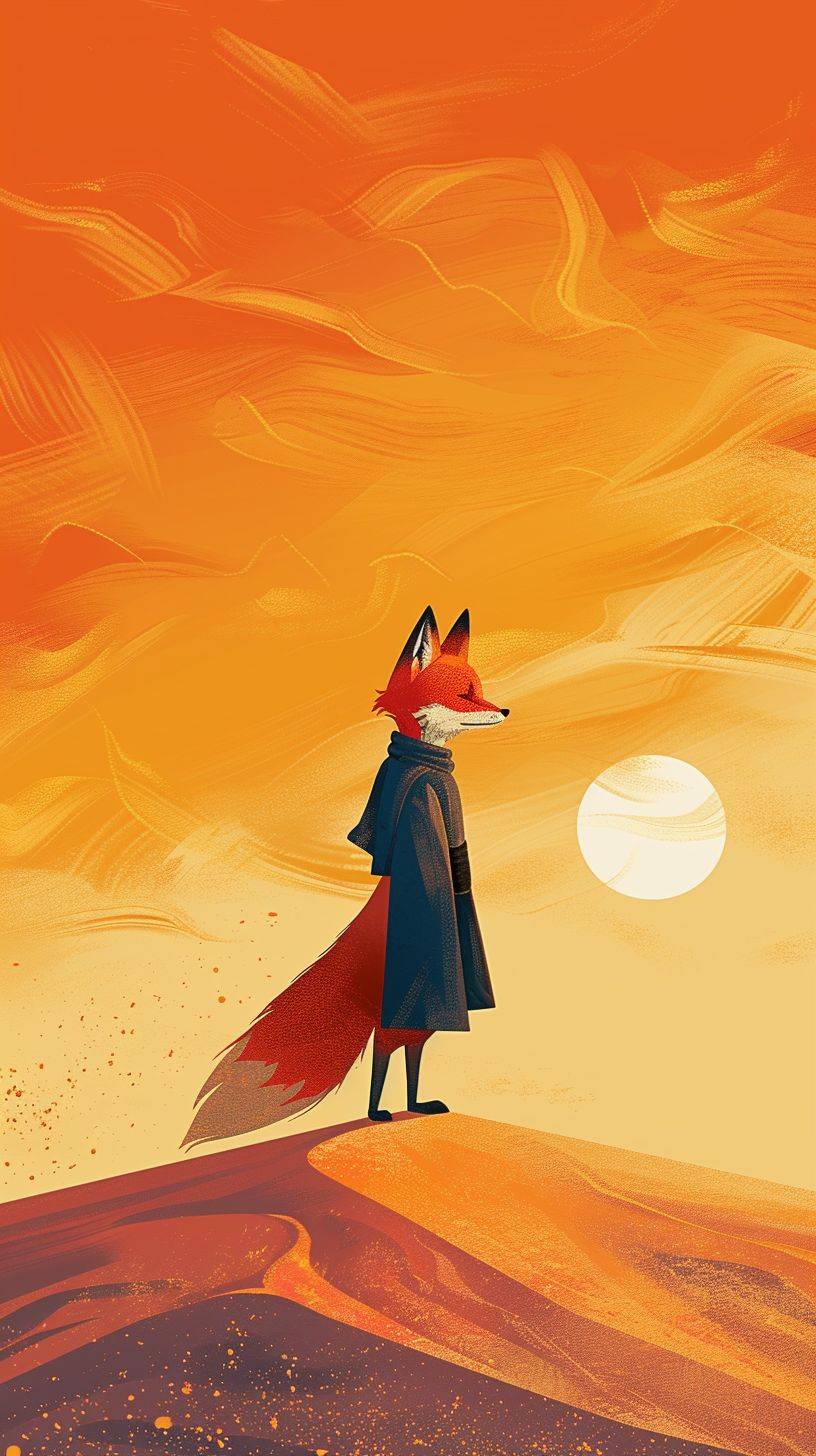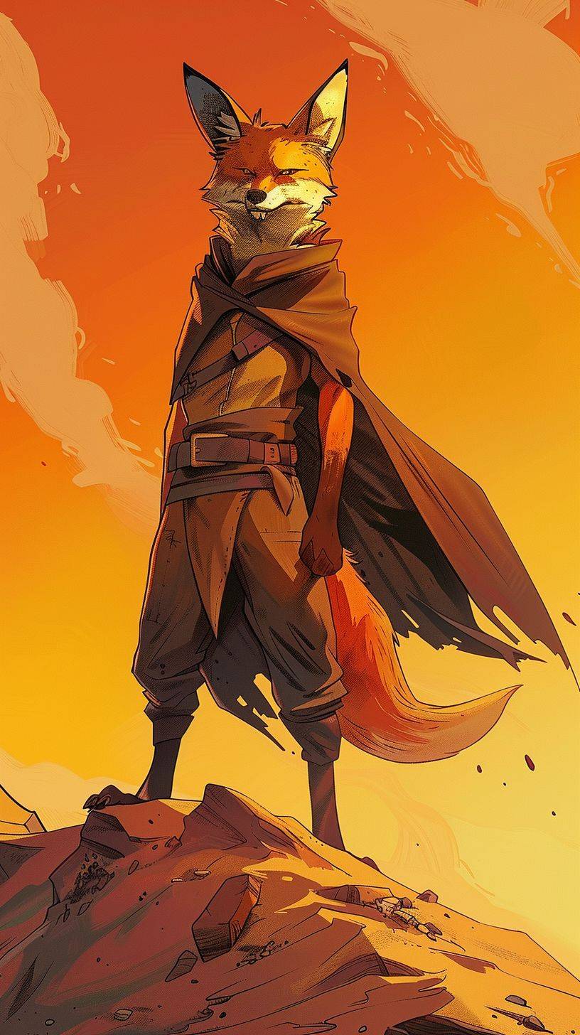 一幅卡通插图,描绘了一只拟人化的狐狸角色,风格类似摩比乌斯,英勇地站在沙丘上,背景是发光的橙色天空,灵感来源于沙丘的科幻美学,姿势动态,散发着神秘的气息。