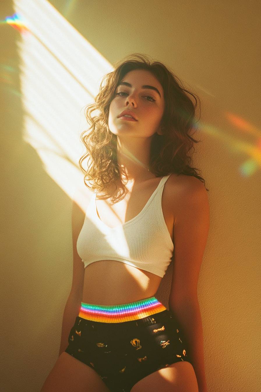 A photograph of an attractive woman in front of beige wall, wearing white tank top and black shorts with colorful neon stripes, a beam of light shines on her from the upper left corner, lens flare, warm colors, kodak film photography --ar 2:3 --v 6.1