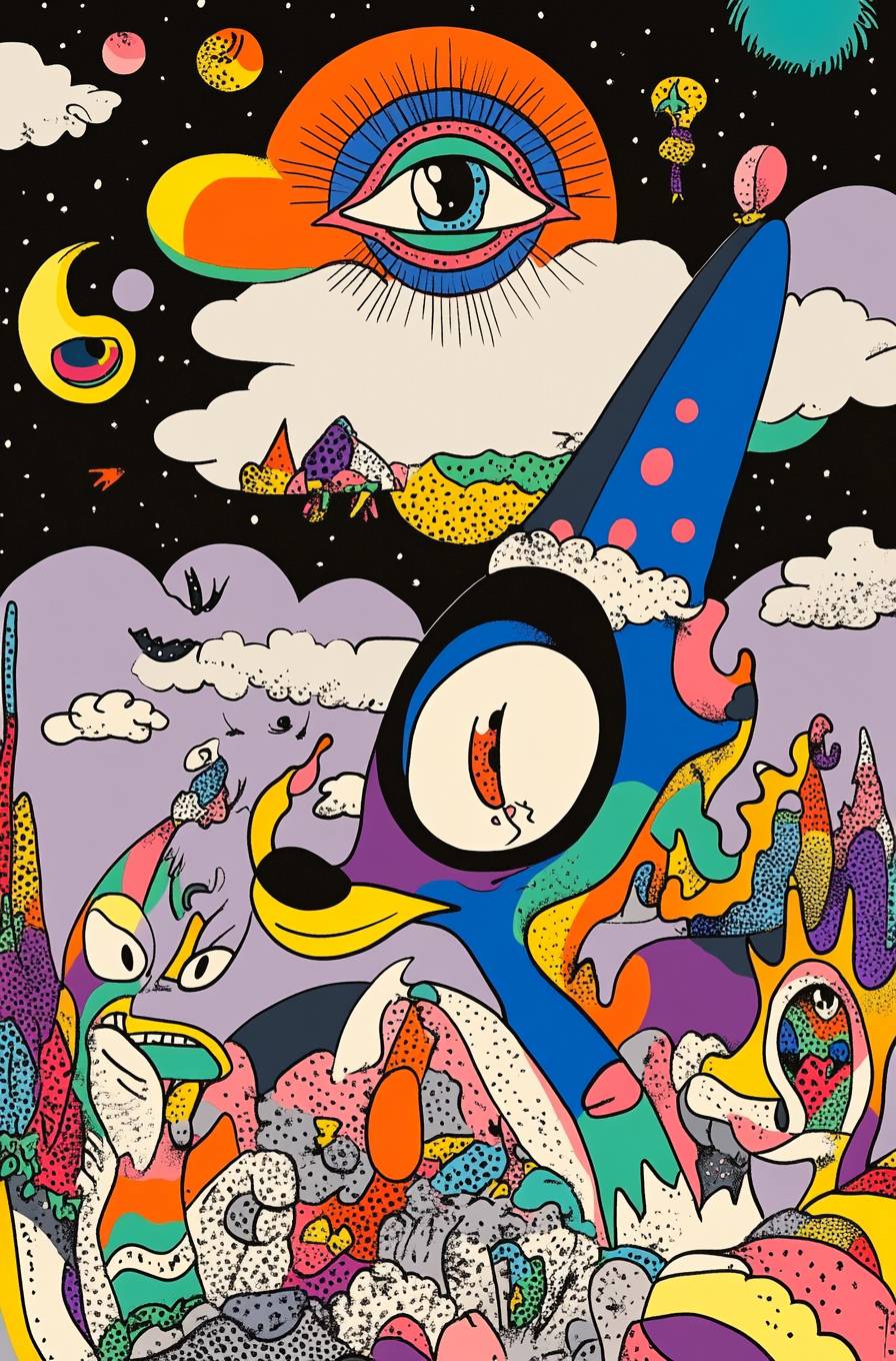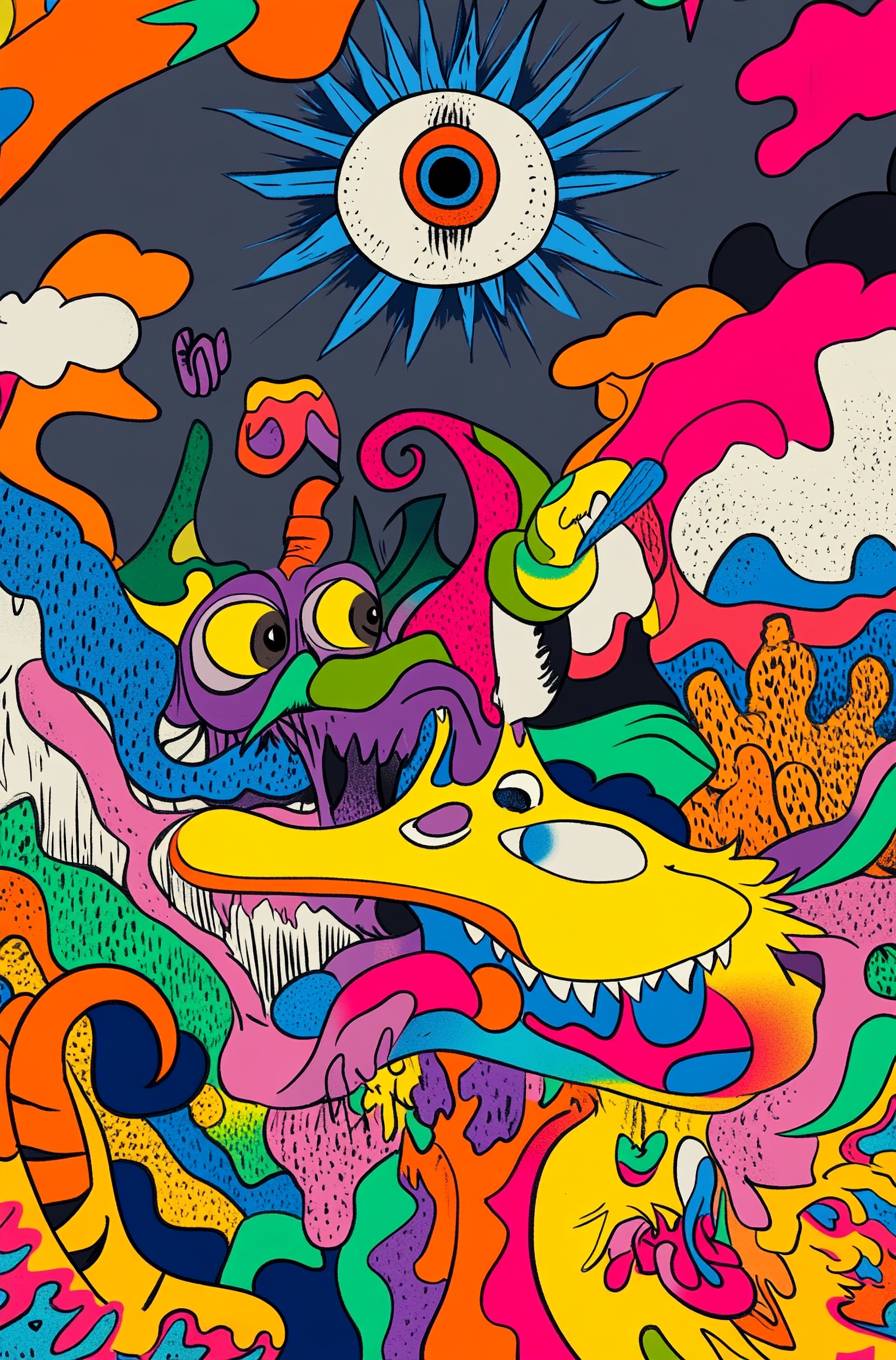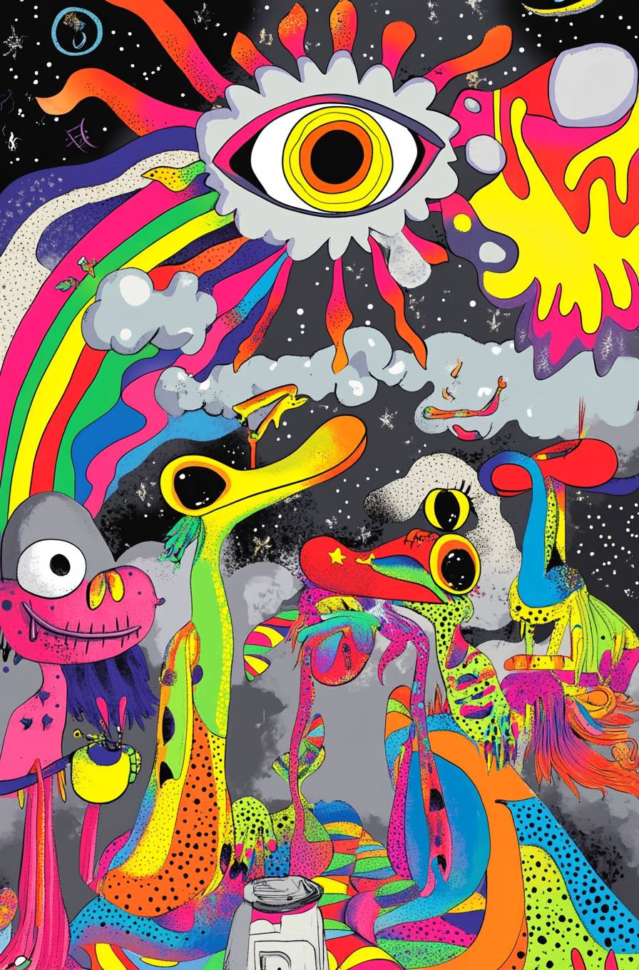 一幅迷幻且超现实的画作,描绘了《乐一通》卡通中的原始坏蛋,以迈克尔·德福尔奇和詹姆斯·瑞齐的风格创作,采用彩虹色的2D矢量插图,带有灰色背景上的半色调图案,以及他们头顶上的一只全视之眼。