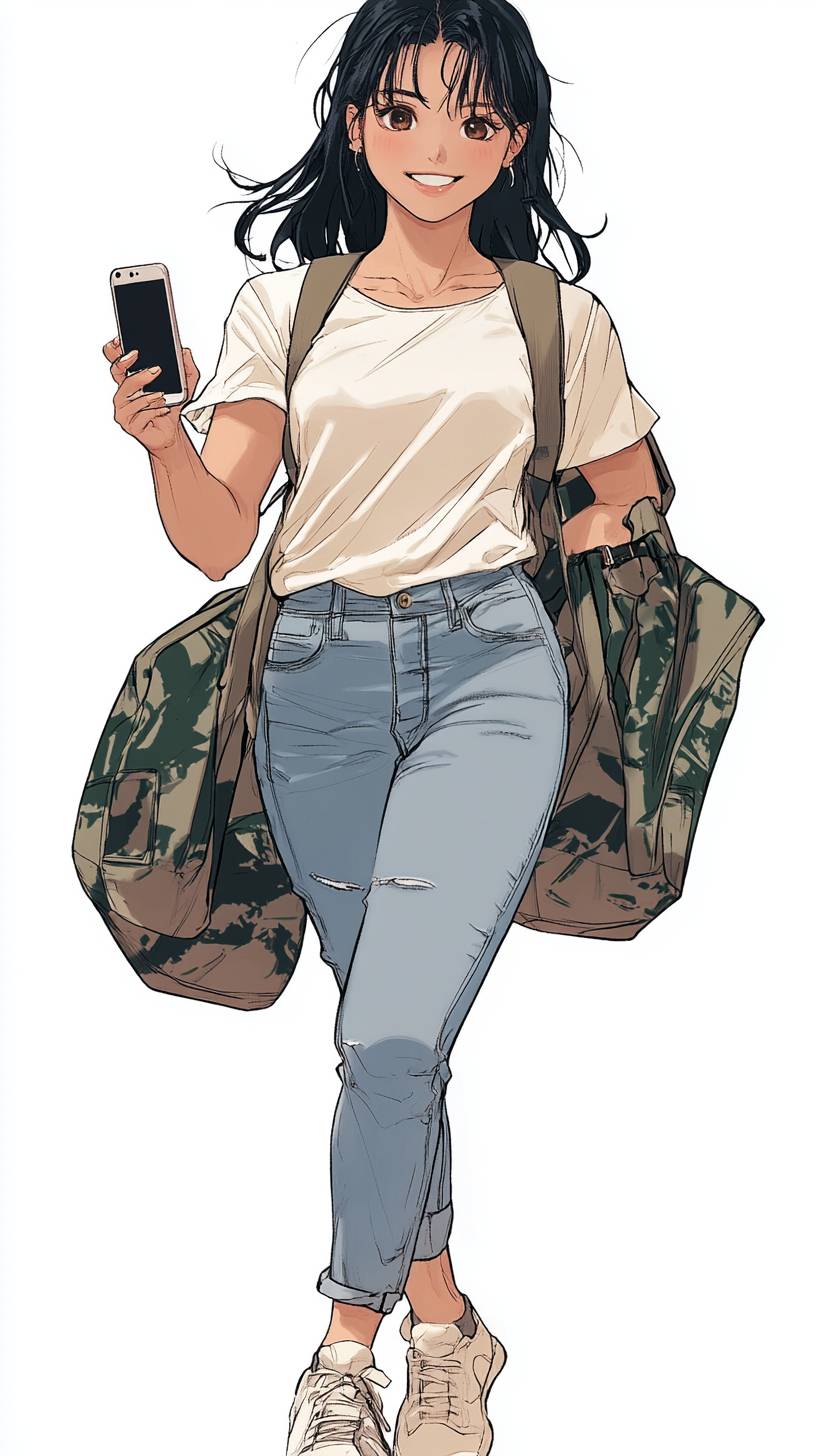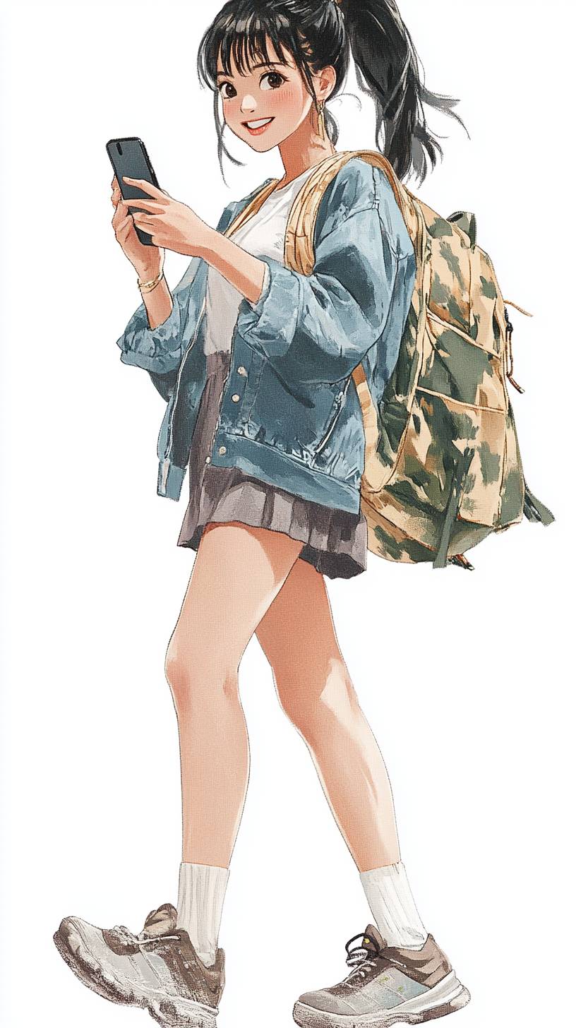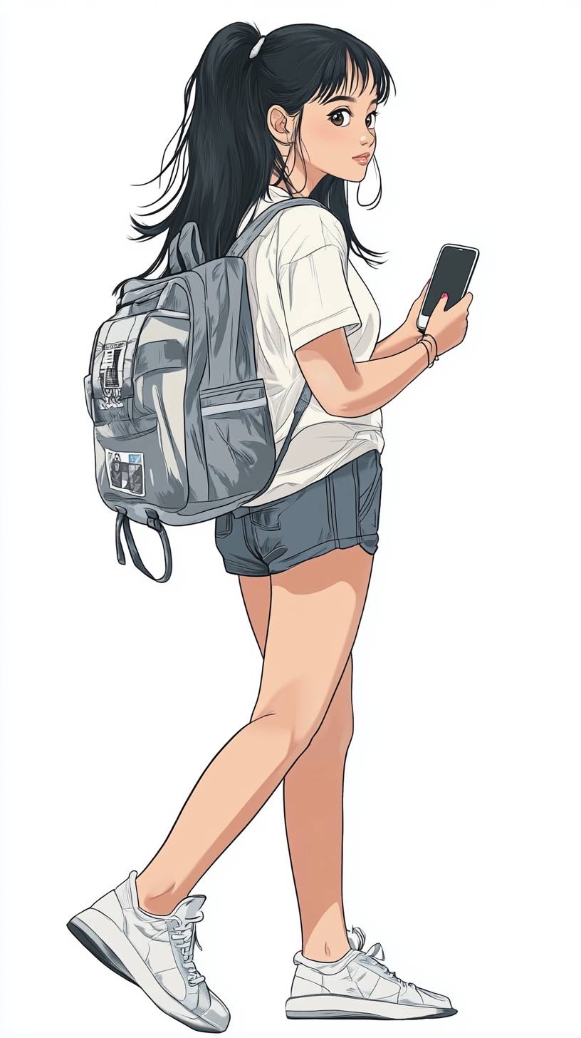 大腿向上。行走姿势。迷人的菲律宾女生,约16岁,穿着休闲的旅行学生服,背着背包,手持iPhone,黑色头发,微笑。白色背景,动漫风格。