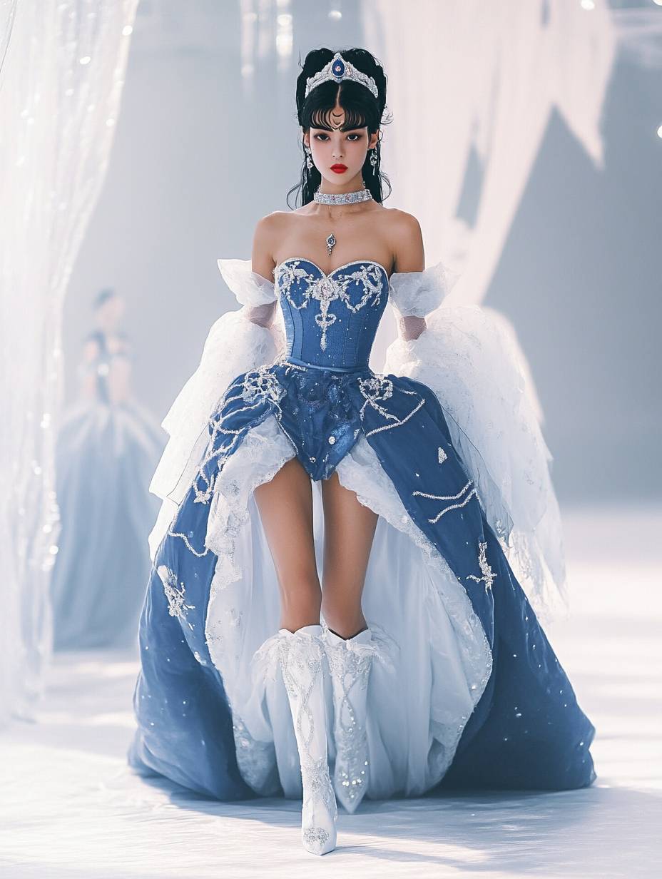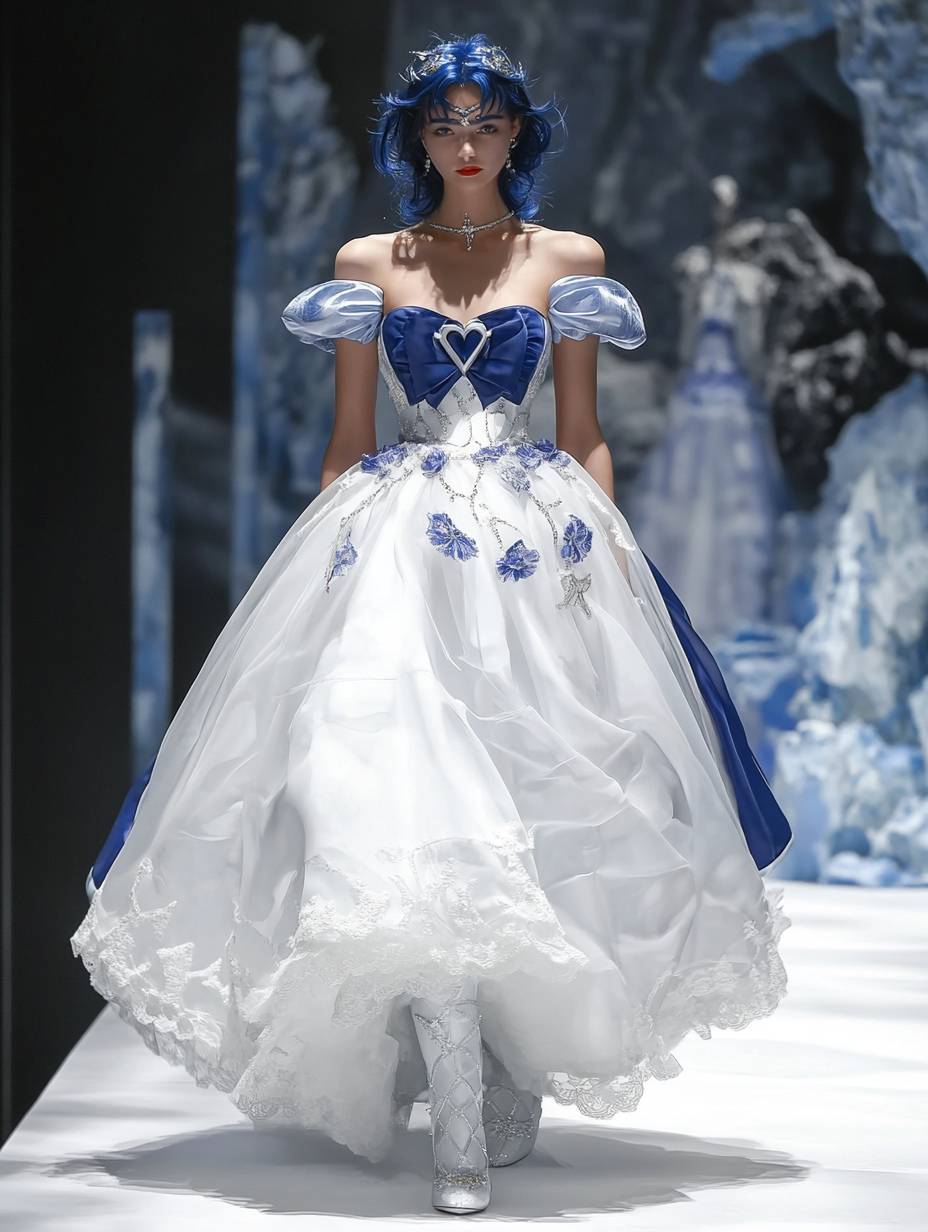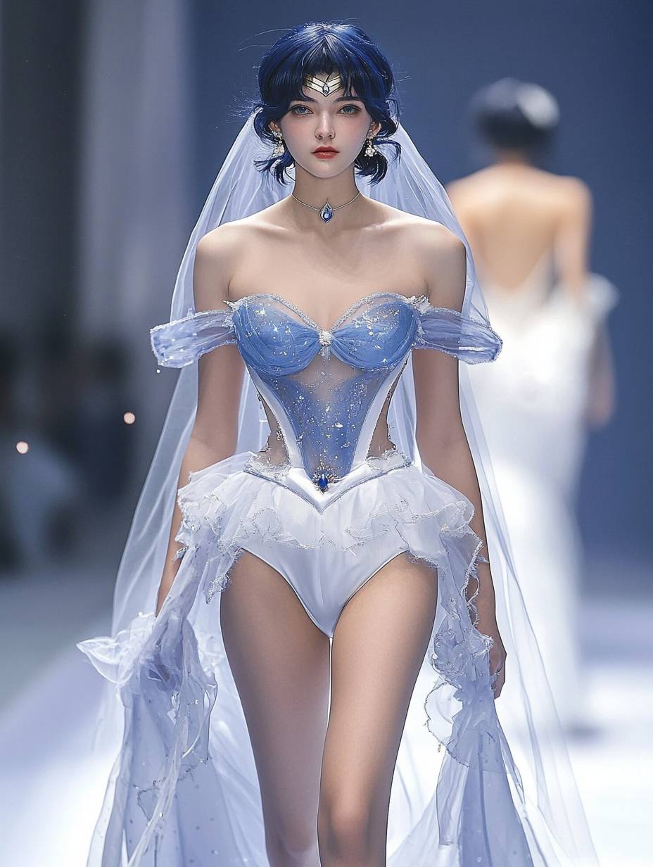 Plump Sailor Mercury as a model walking down the catwalk, modeling the latest wedding fashion --ar 3:4 --v 6.1