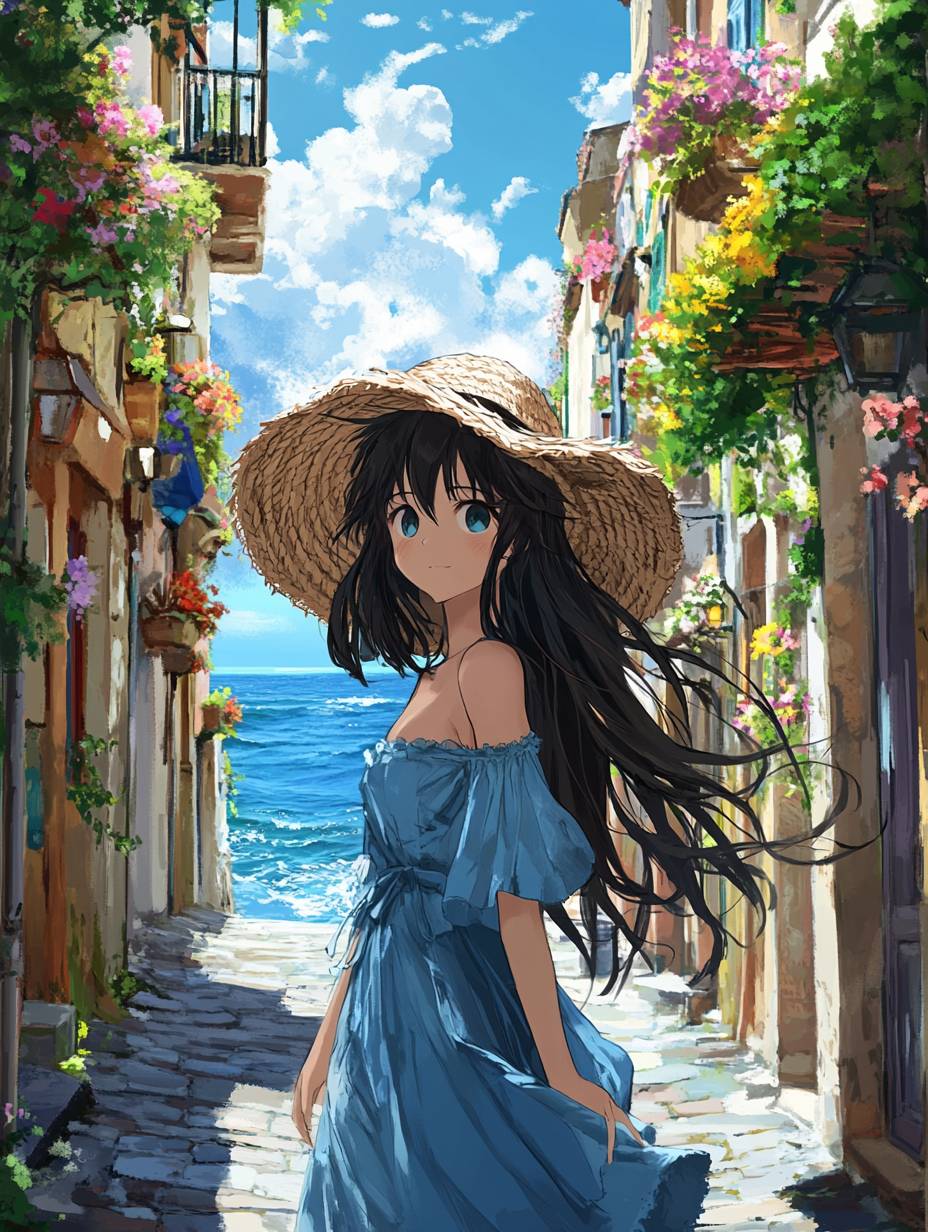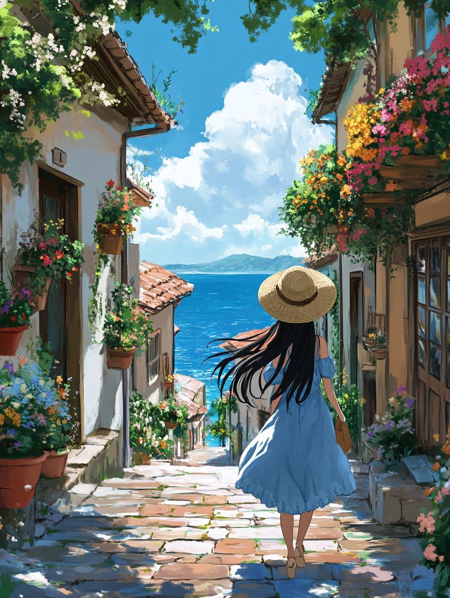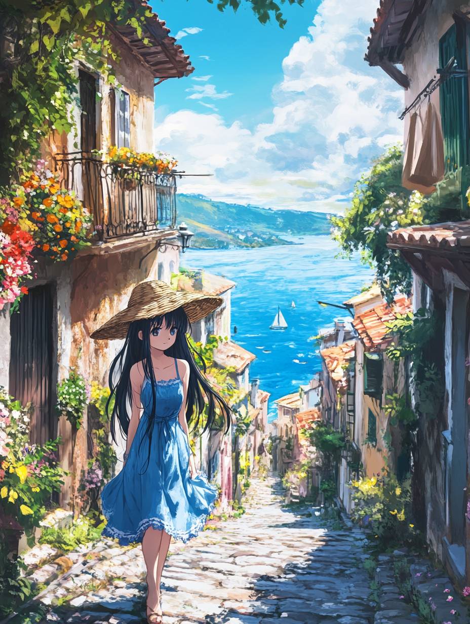 一位美丽的动漫女孩,穿着蓝色连衣裙,长发披肩,走在充满活力的海滨小镇上。她的草帽遮住了脸庞,沿着如画的街道移动。天空清澈,柔和的云朵飘浮,海洋在背景中闪烁。每栋建筑都是一阵色彩,窗户和门上盛开的花朵倾泻而下,营造出一种如同宫崎骏《风之谷》漫画中一般的场景,既迷人又宁静。