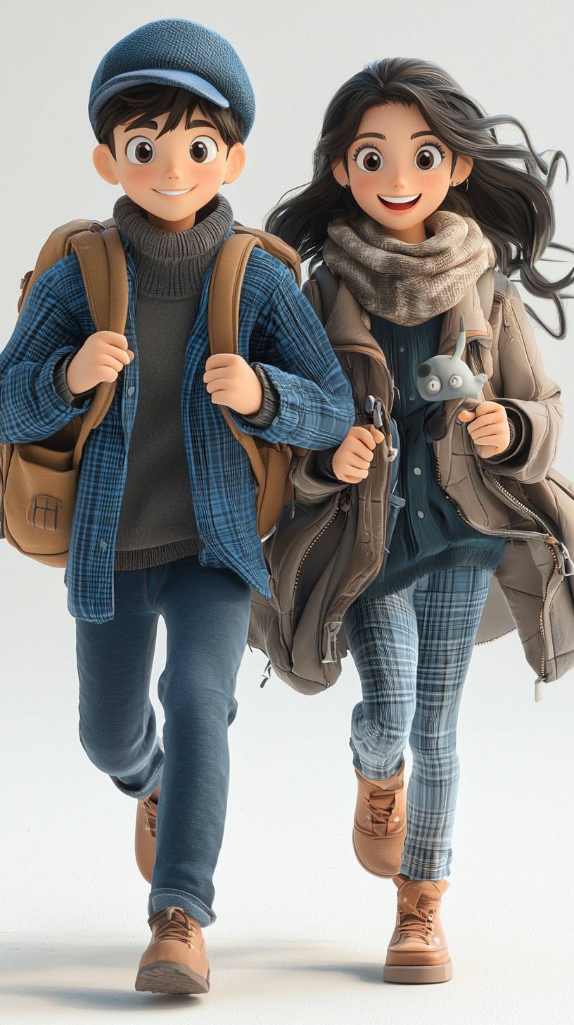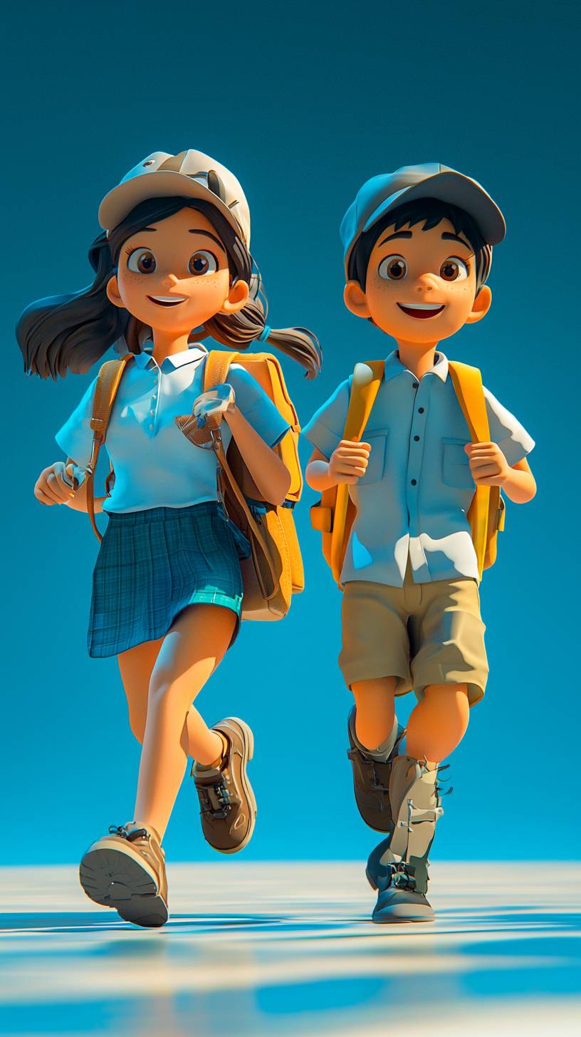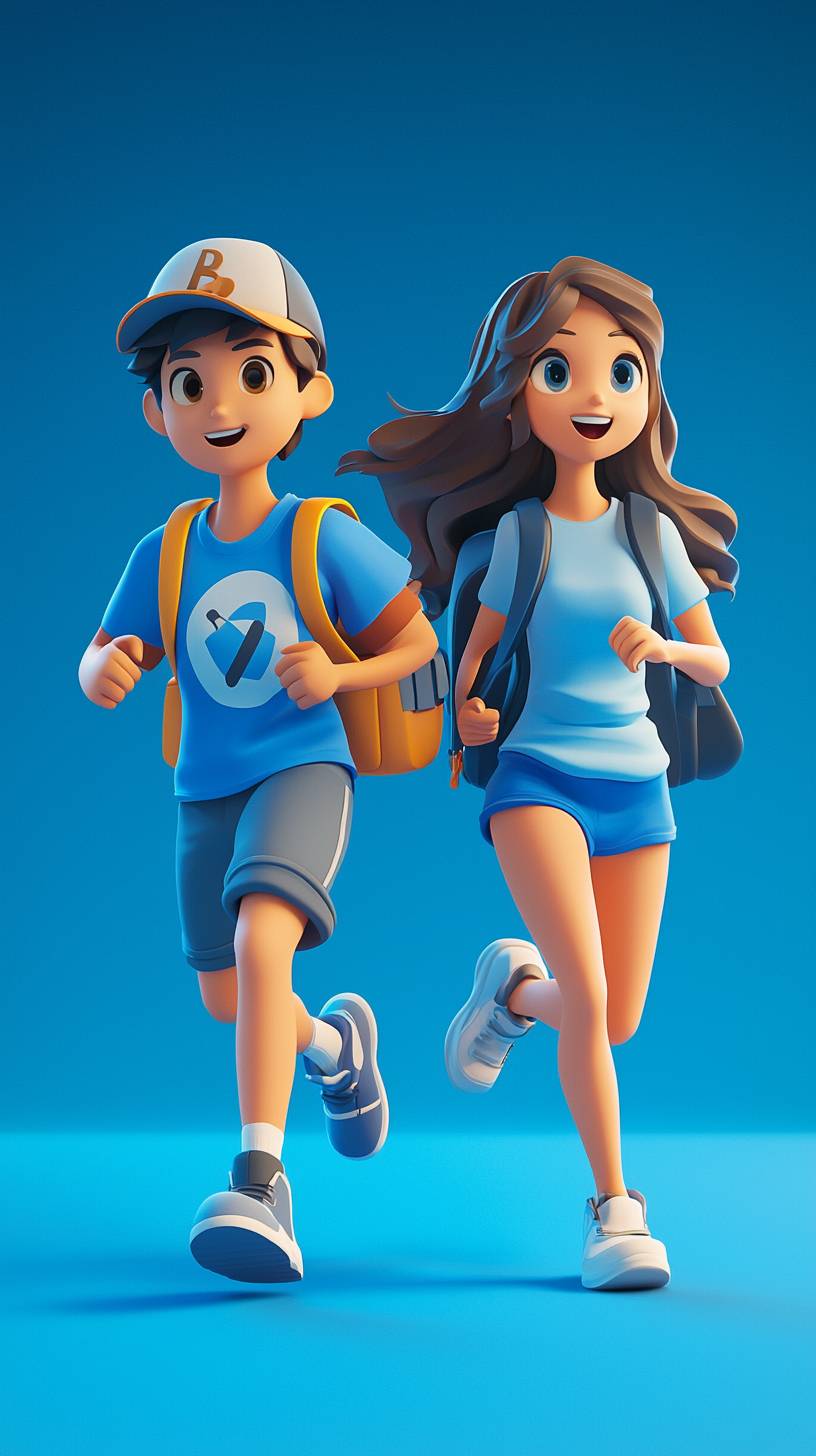 3D cartoon style, front view, a girl with a backpack and a boy with a hat, dressed in middle school clothes, running forward together. A pretty girl of 18 years old in a student's costume, running forward together, blue color theme, full body --chaos 6 --ar 9:16 --quality 2 --stylize 250 --v 6.1