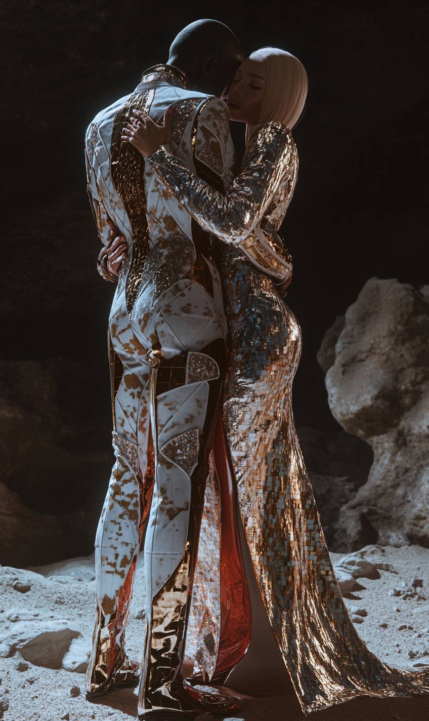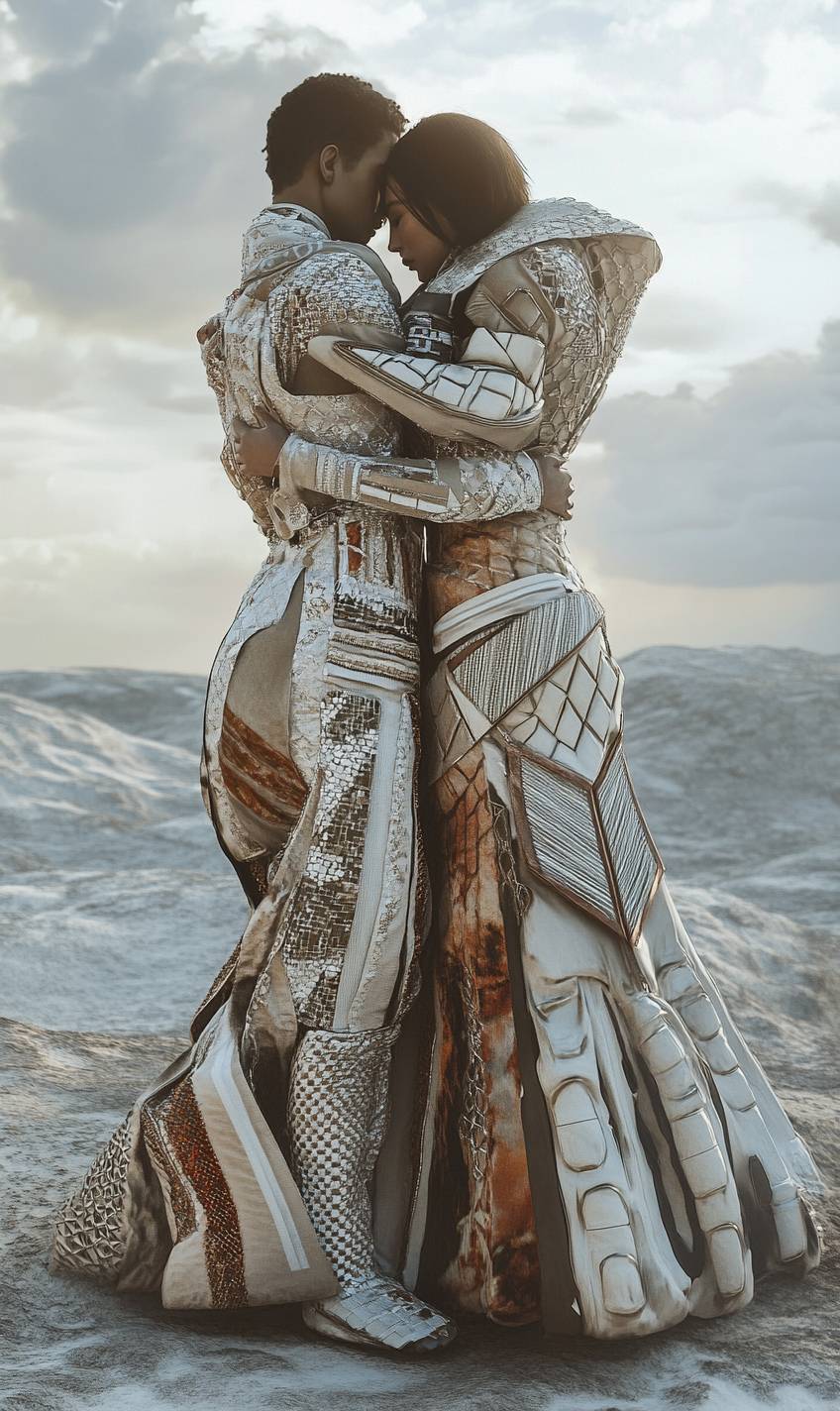 a full body shot of female model and male model wearing futuristic intricate GUCCI outfits with geometric patterns. They are on an unknown planet in a loving embrace. Use light and shadow to symbolize the unity of their hearts and the courage it takes to maintain such a connection. Dutch angle, cinematic shot, sharp and highly detailed, cinematic lighting, photorealistic, in an ethereal dream land, muted color palette, atmospheric, moody, dark, 50mm, 4k, hdr. --v 6.1 --ar 3:5