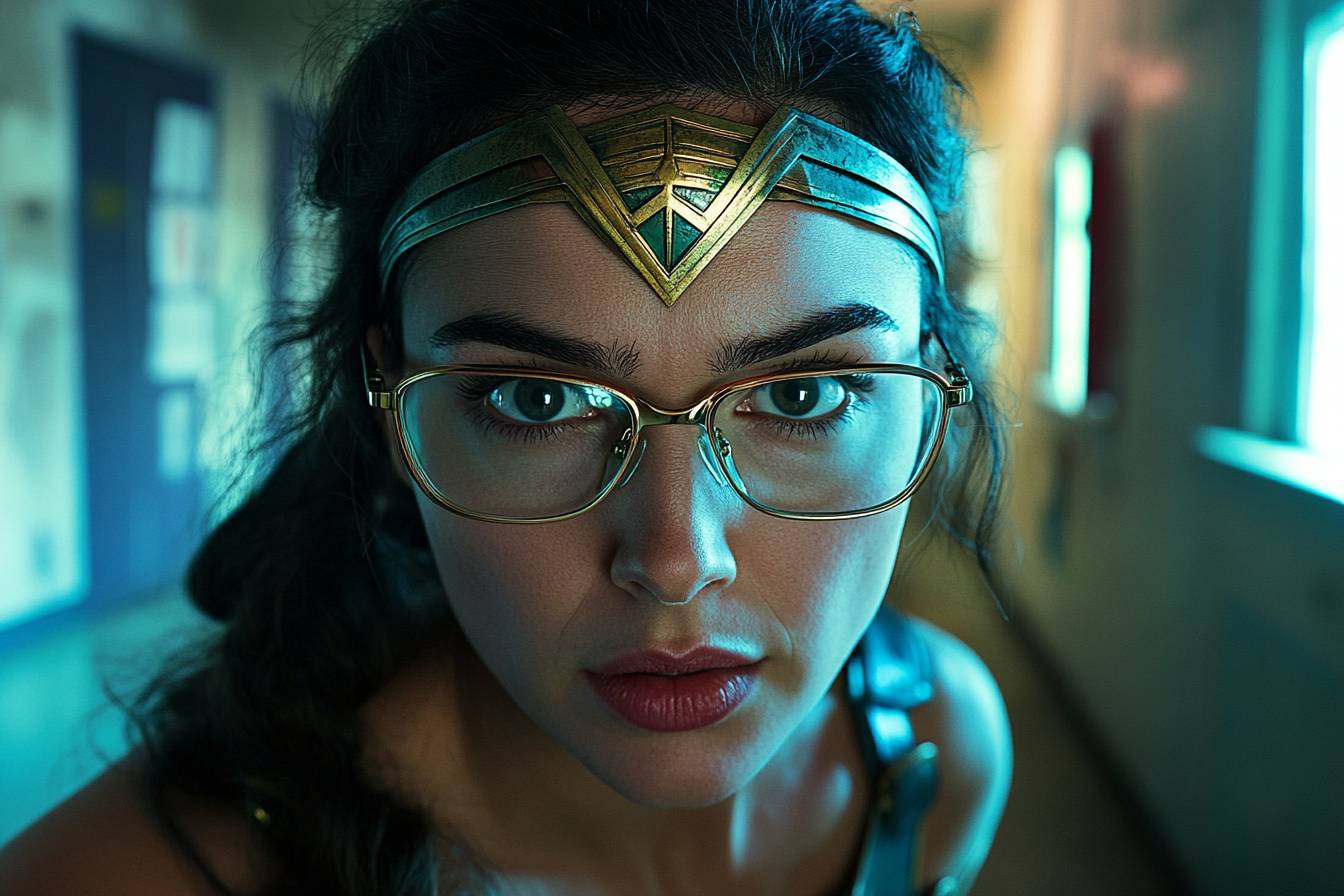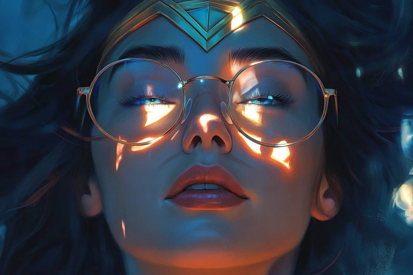 Wonder woman wearing glasses with nearly invisible frames, giving the illusion of floating eyes, in a mental hospital, glasses highlight art pieces, --v 6.1 --ar 3:2