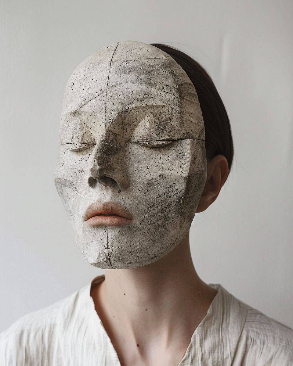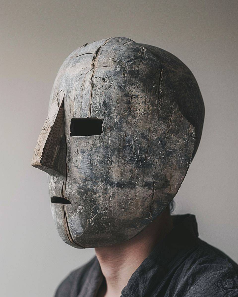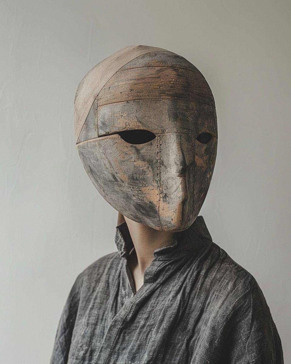 Portrait photograph of a person with a concrete and wooden mask, minimalist composition, muted colours, solid white studio background --ar 4:5 --stylize 250