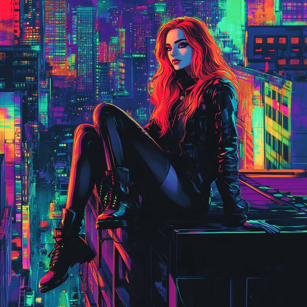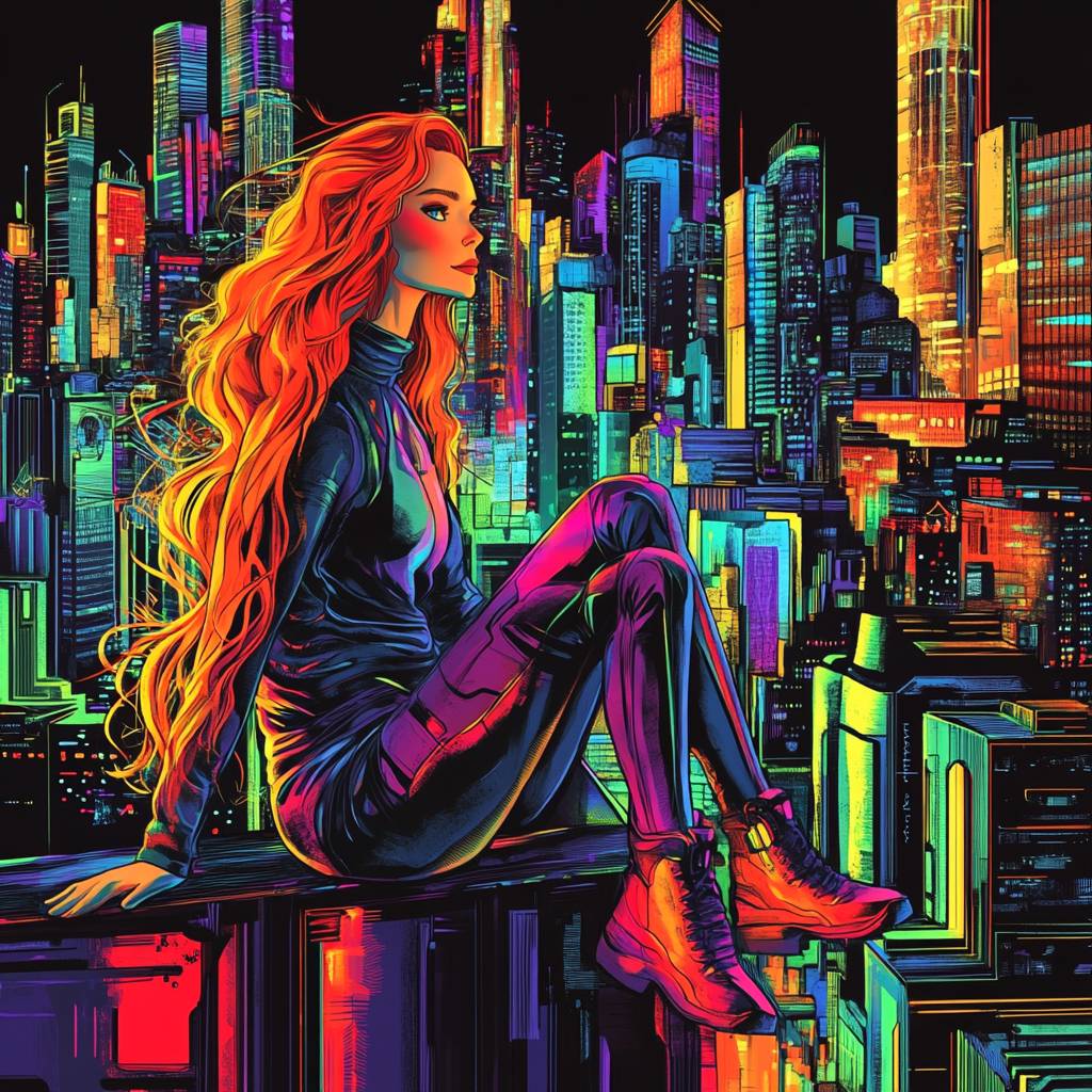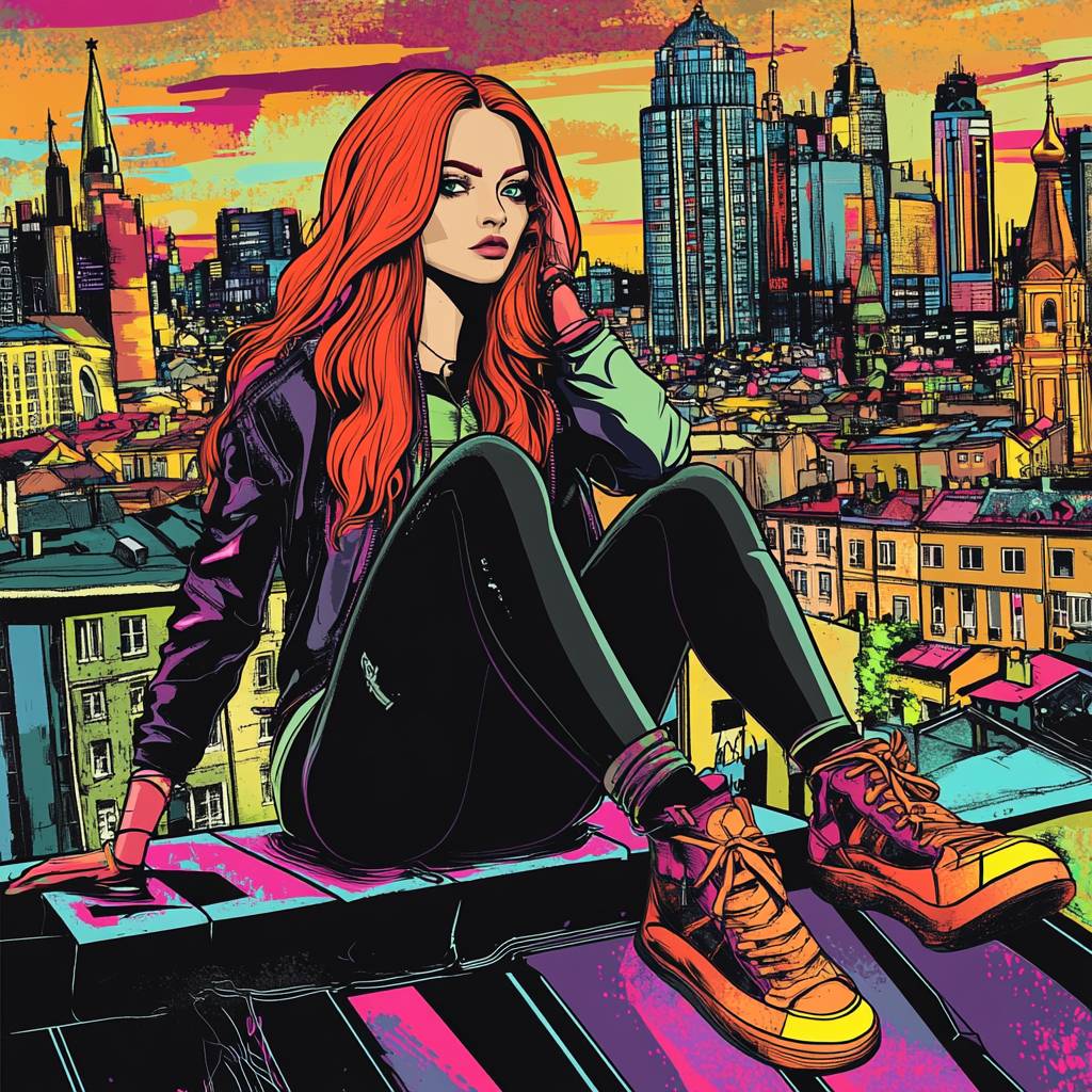 A beautiful woman with long red hair sits on the roof of Moscow, surrounded by multi-colored city buildings, in the style of cyberpunk with comic book illustration influences. The artwork features bright colors against a black background with vector graphics, an art deco influence, and bold lines and shapes. It has high resolution, high detail, high contrast, and is a digital painting with smooth edges and intricate details. The image has sharp focus and is hyper-realistic in style. --v 6.1