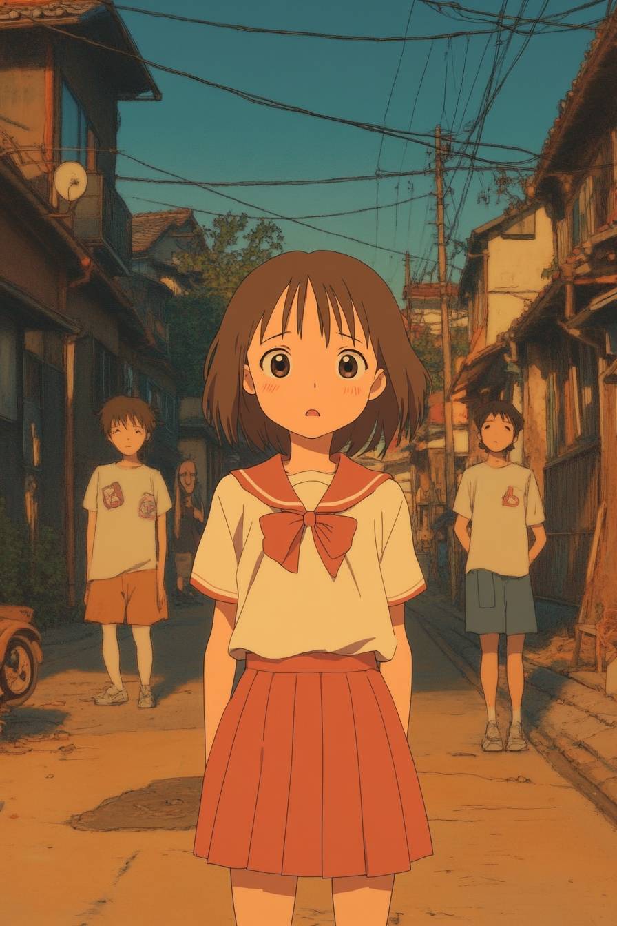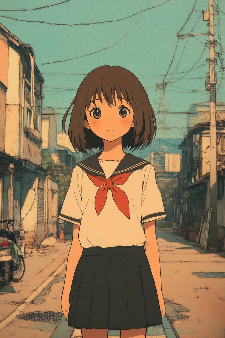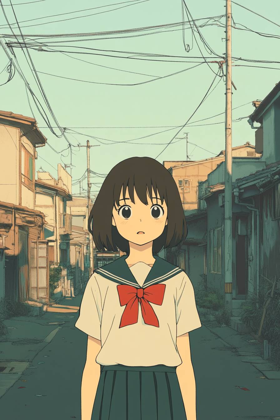 The comic depicts an anime girl lain iwakura from experimental lain with short brown hair and big eyes wearing a school uniform, standing on the street in front of her house, with red bows tied around her neck. The background is of urban streets at dusk, with high-definition lines, flat illustrations, a punk-inspired style, and full-body portraits in . --ar 85:128 --personalize h5q2fxm --stylize 250 --v 6.1