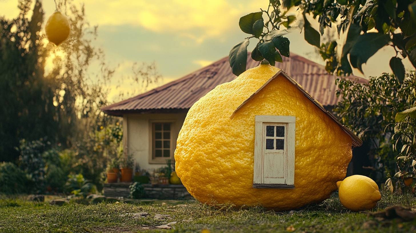 photo of a house, made of a huge lemon, natural lighting --ar 16:9 --style raw --stylize 200