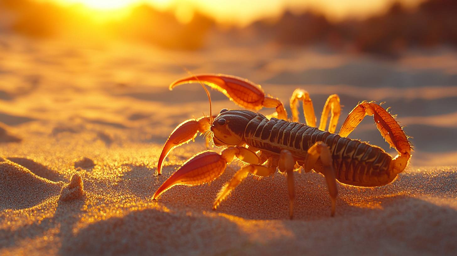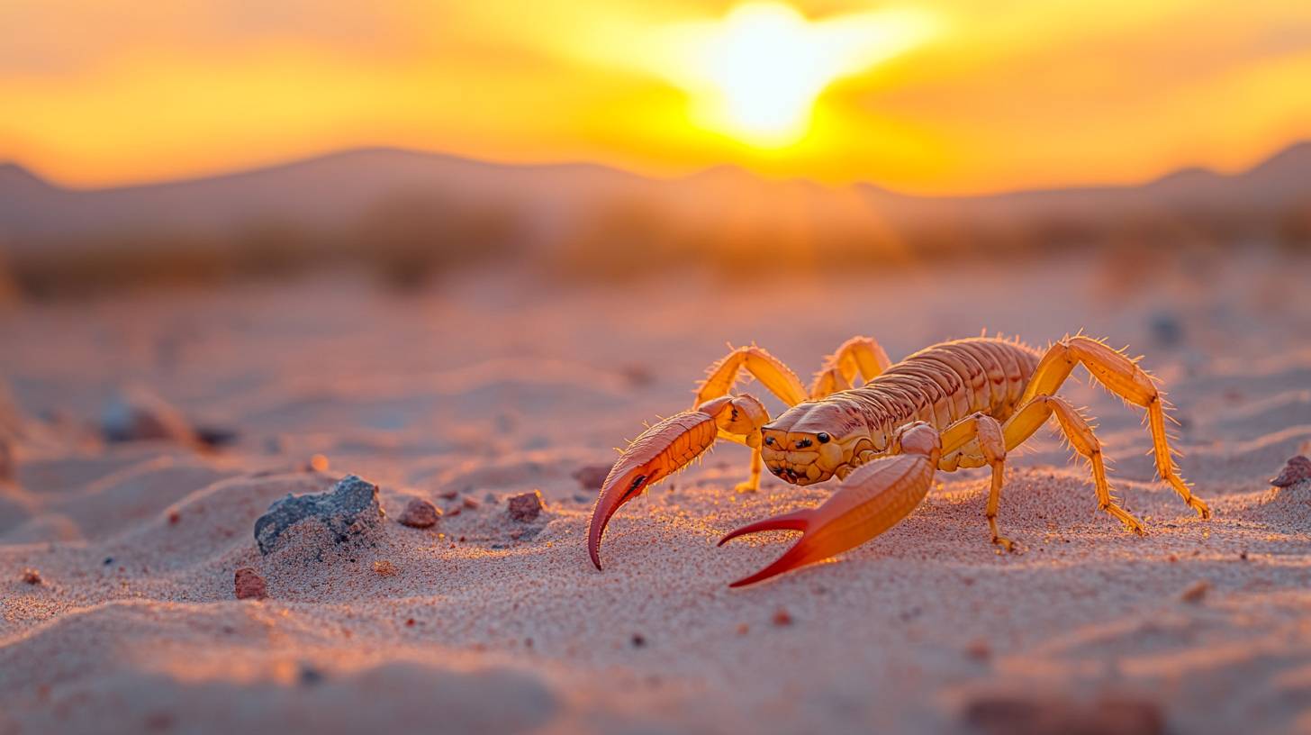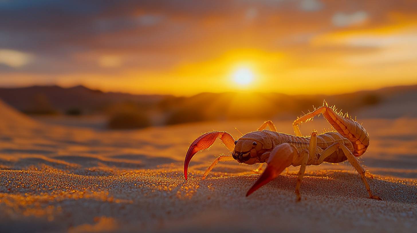 wildlife photo of a scorpion, in desert sand, sunset, backlit --ar 16:9 --style raw --stylize 200 --v 6.1