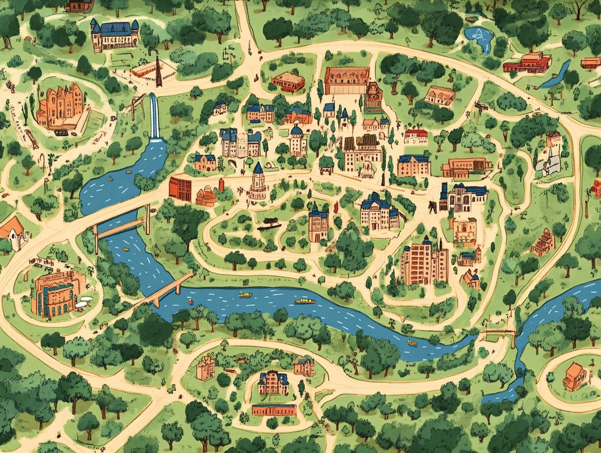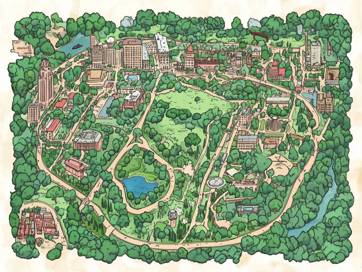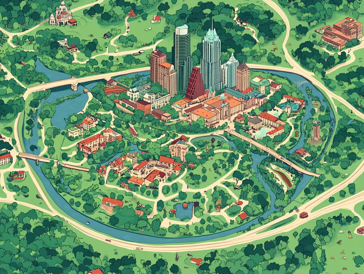 一幅准确的德克萨斯州奥斯丁的地图,俯视图,风格类似于吉卜力工作室。