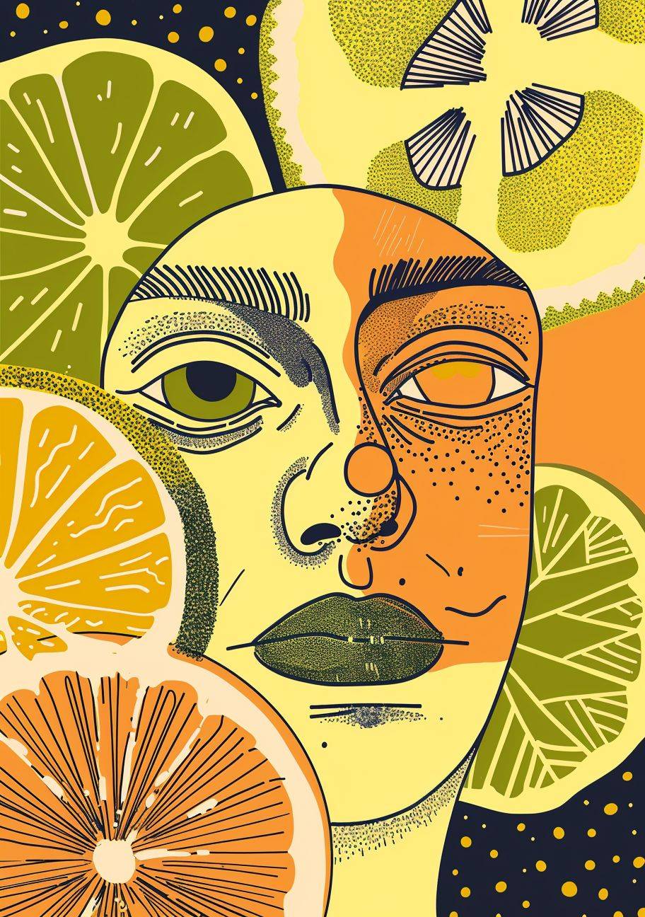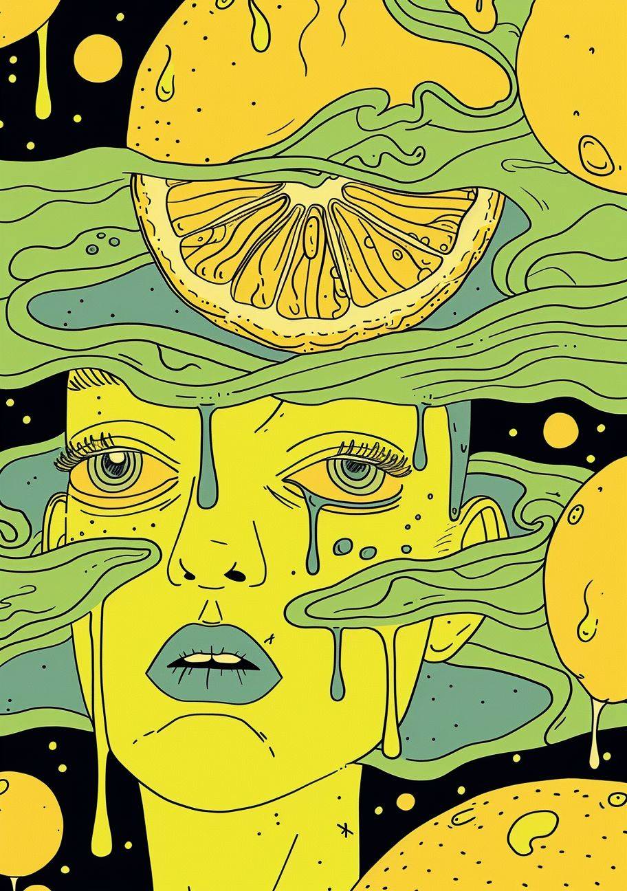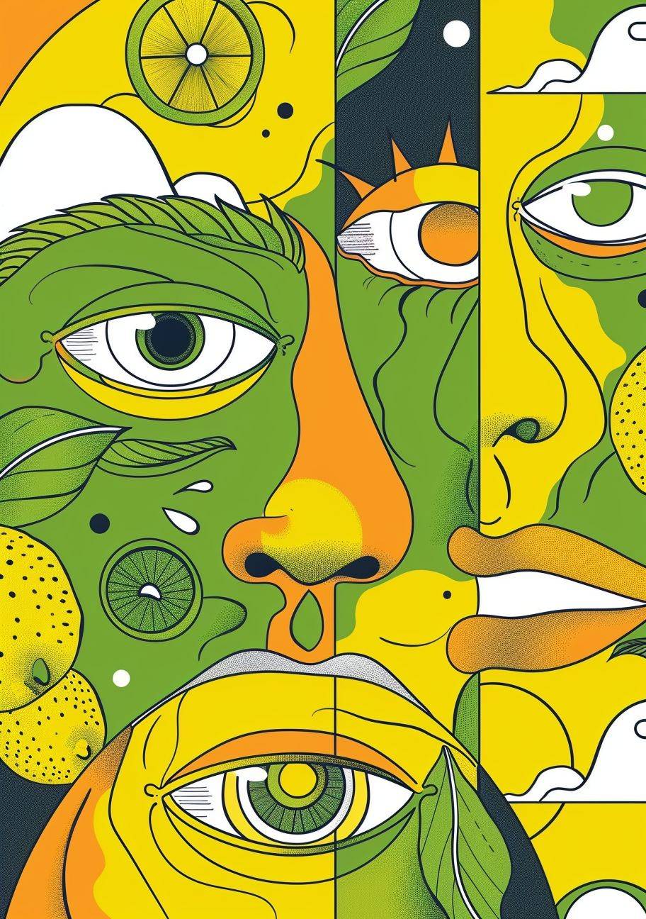 一个由柠檬和太阳构成的世界,神秘而美味,采用柠檬和青柠色调以及简单的线条插图。