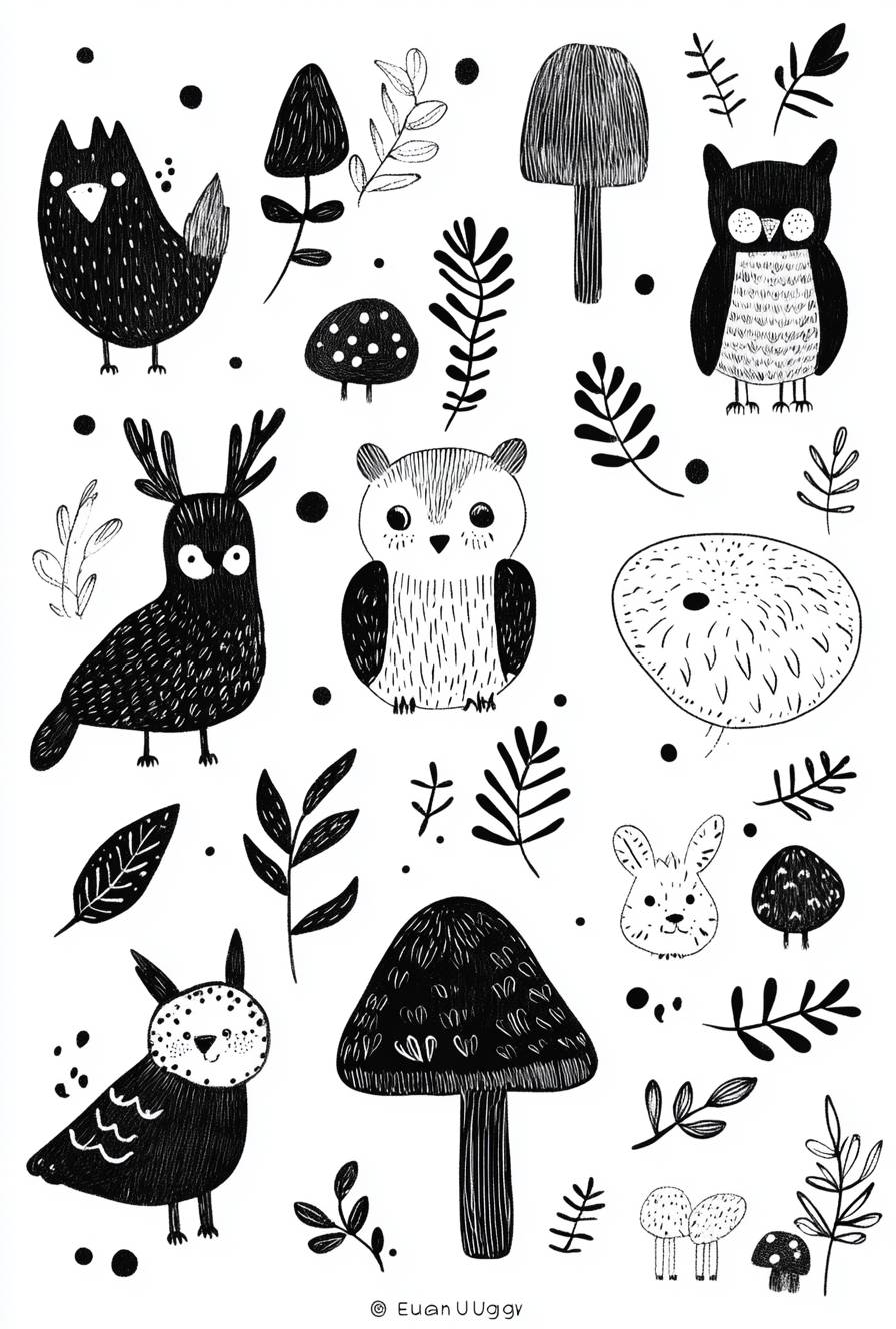 一页适合儿童的涂鸦,简单的形状,黑白风格,包含斯堪的纳维亚风格的森林动物,如鹿、狐狸、猫头鹰、鸟、兔子、蘑菇、树木和树叶。由尤安·乌格洛创作,设计风格充满奇幻。它包括各种林地生物,如猫头鹰、兔子、熊、蘑菇、树枝、叶子或其他自然元素。手绘涂鸦艺术插图。孤立于白色背景上。