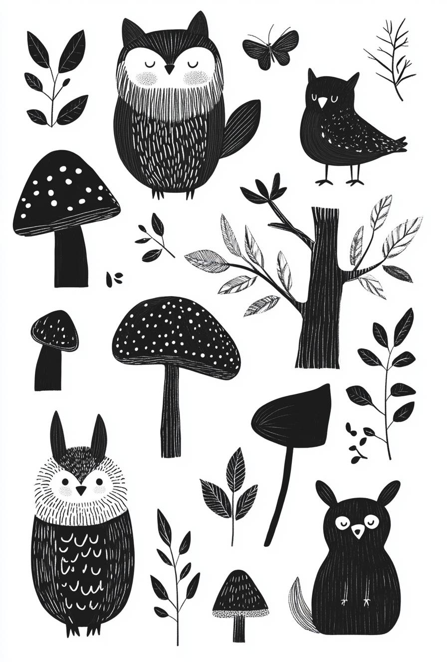 A page of doodles for children, simple shapes, black and white, featuring forest animals like deer, foxes, owls, birds, rabbits, mushrooms, trees, and leaves in scandinavian style.. by Euan Uglow, with whimsical designs. It includes various woodland creatures such as an owl, rabbit, bear, mushroom, tree branch, foliage, or other natural elements. Hand drawn doodle art illustration. Isolated on white background. --ar 43:64 --stylize 250 --v 6.1