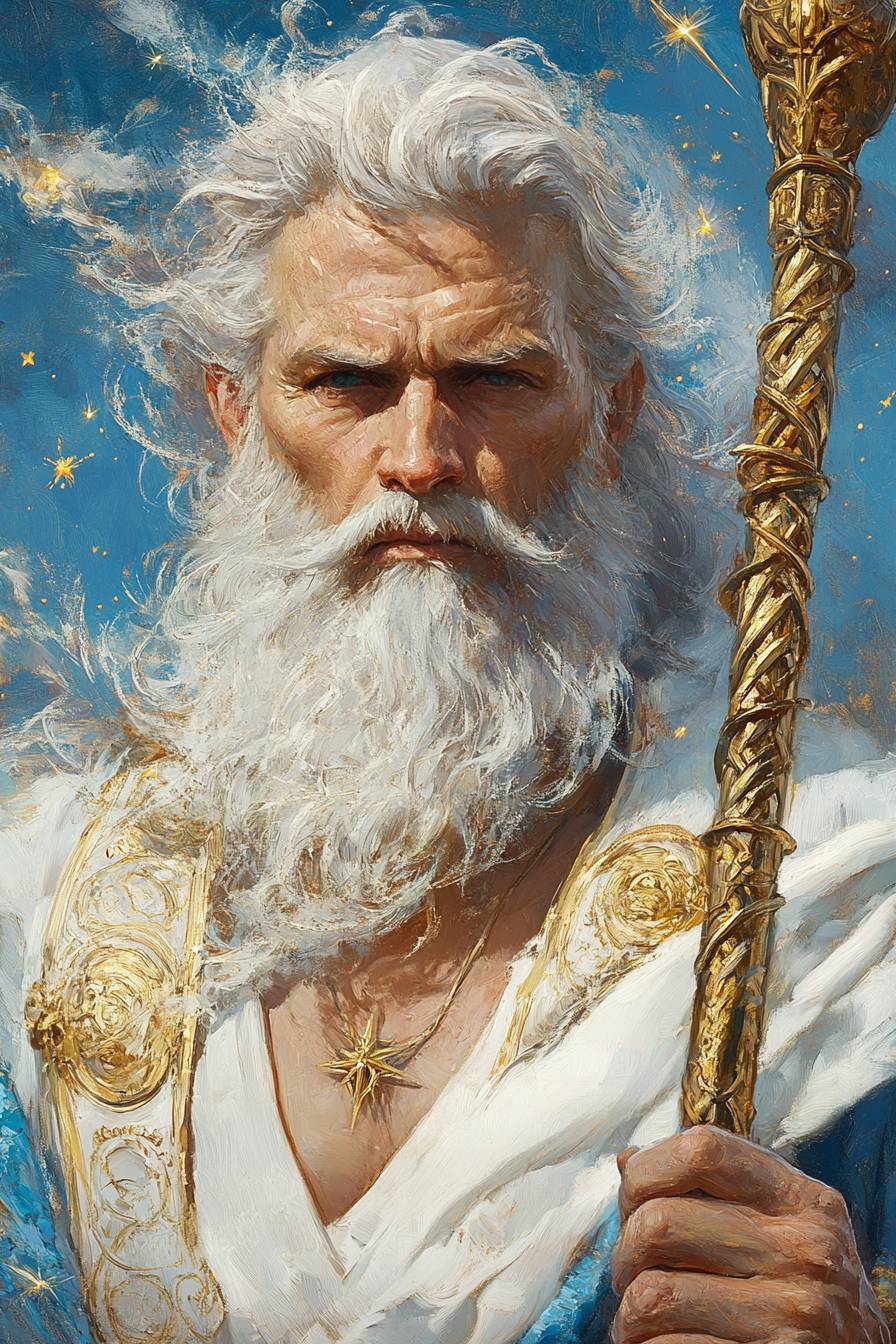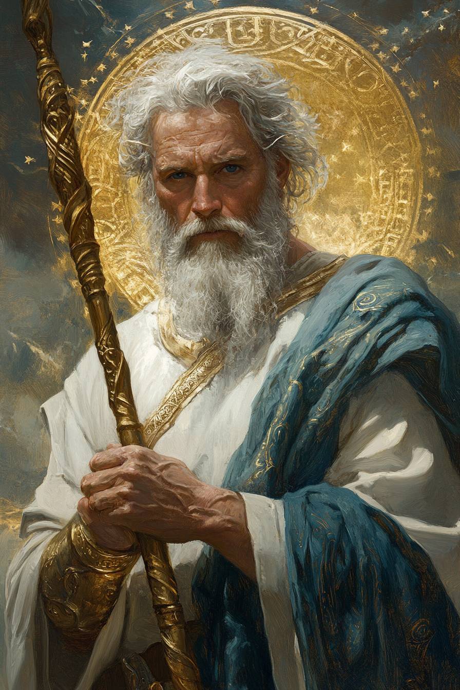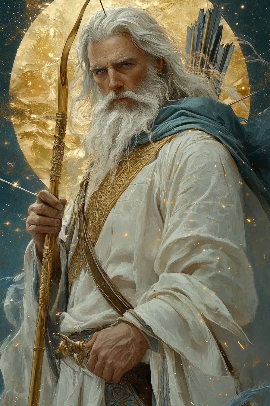 Ancient beautiful god of world Rod a gray-haired blue eyed old man with a long beard, in light white gold blue clothing, in his hands is a golden staff, and behind his back is a quiver with stars, the stars are the personification of the swift winds, and the bowstring is pulled by the lord of the world Rod, who shoots swift stars into the winds in all directions under the sky, Rod has blue eyes a reflection of the boundless ocean of the sky, he sails in a boat on the azure sea or on the airy expanses of the sky and blows a horn, announcing his approach, sunny day, background sun light jets Celtic ornament, painting by Aleksandr Shilov --ar 2:3 --stylize 250 --v 6.1