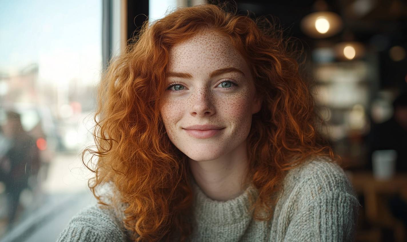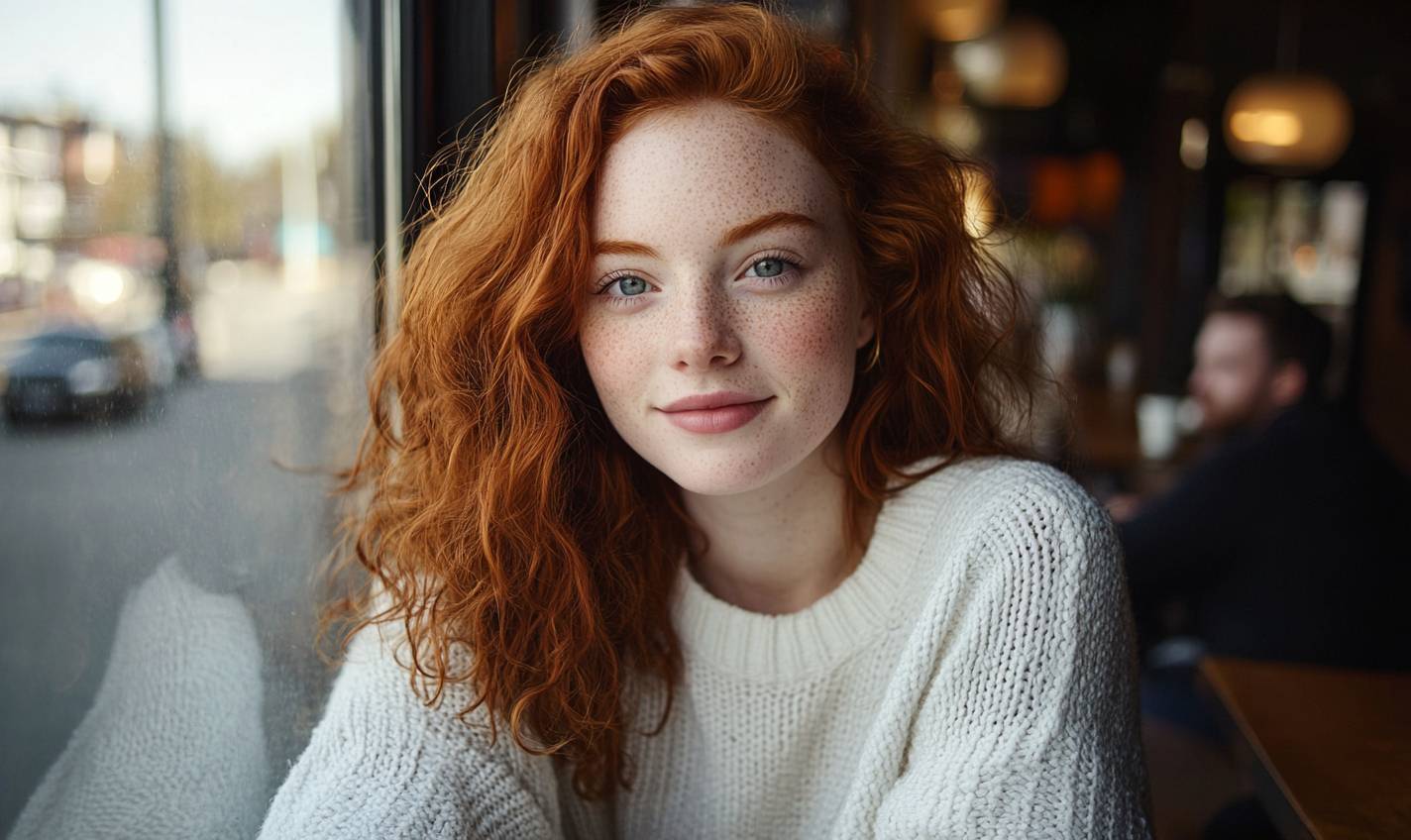 一位年轻女性的广角肖像,她大约二十五岁,拥有自然卷曲、略显凌乱的红发,脸上点缀着淡淡的雀斑。她坐在一个温馨的城市咖啡馆的大窗户旁,在一次放松的瞬间被拍到,正微笑着。窗外的自然光在她脸上投射出柔和的高光和阴影,展现出真实的肤质——如可见的毛孔、肤色的细微不均和一些淡淡的瑕疵或雀斑,增添了她的自然美。她的头发虽然生动,但有几缕飞扬的发丝在光线中闪耀,突显出未经打理的感觉。她穿着一件稍显皱褶的宽松针织毛衣,增添了随意的氛围。在背景中,咖啡馆微微模糊,但窗户上的污点、桌上的一只随意放置的咖啡杯,或是中途移动的略显失焦的人影,均为场景增加了真实感。画面的一侧可能有轻微的模糊或光线的眩光,进一步强调了这张照片的自然、未偶然的特性。
