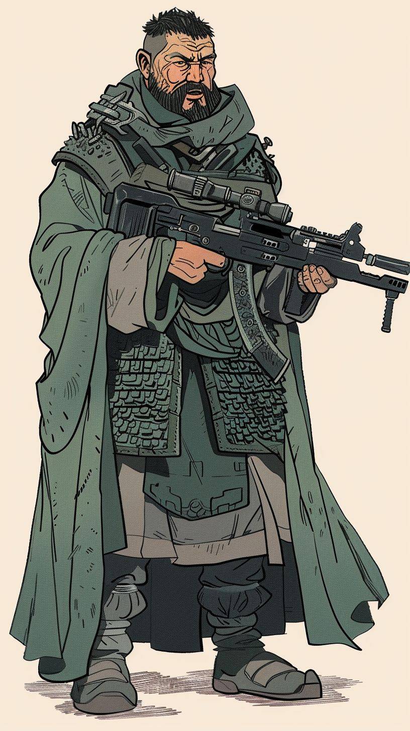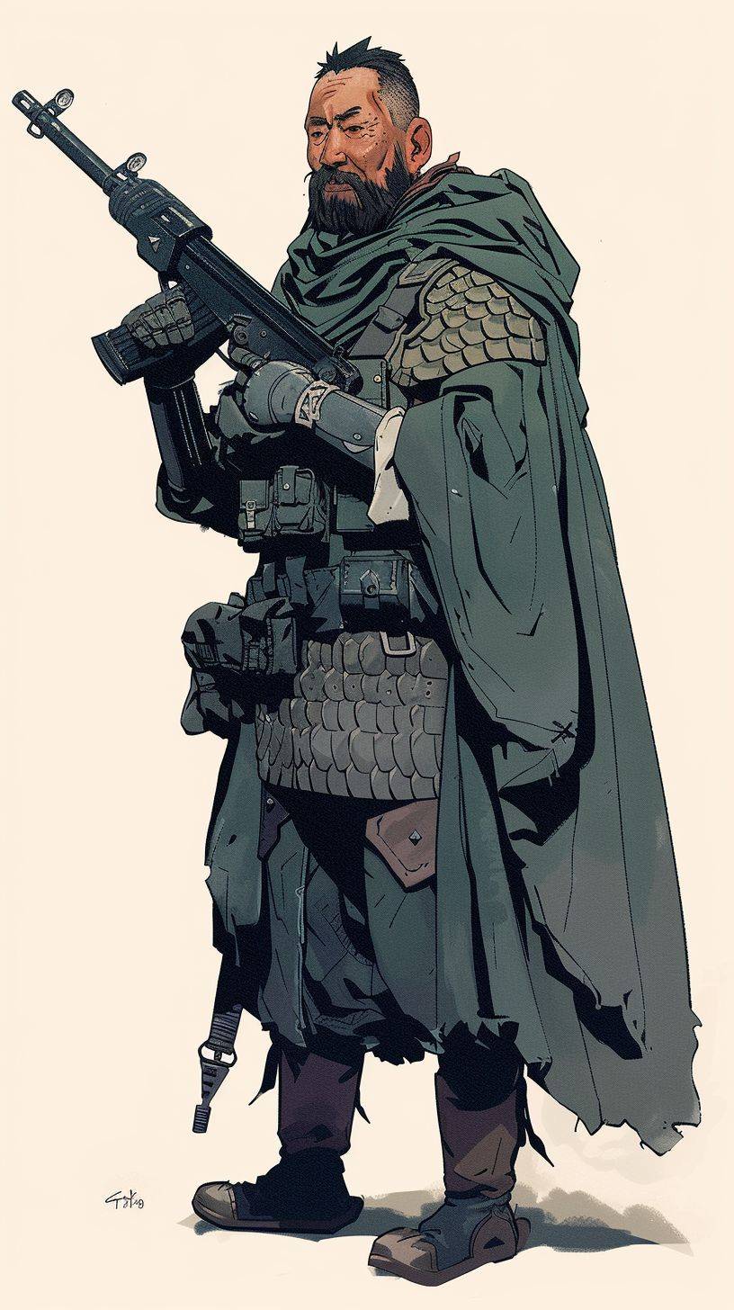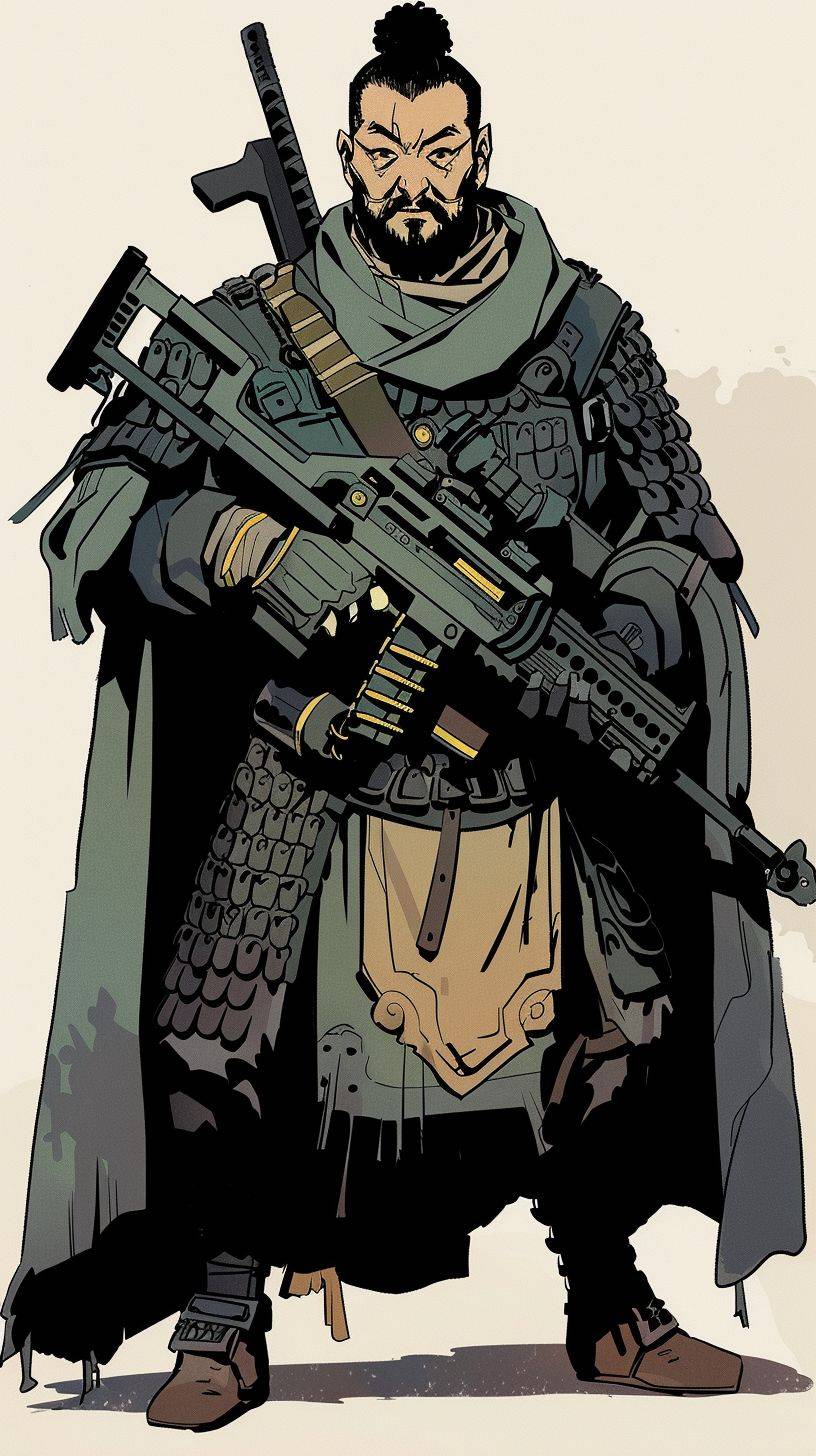 一位古代中国士兵手持机枪,身穿灰色斗篷和深绿色盔甲,盔甲上有黑色鳞片。他的头发和胡须都很短,面带微笑。风格类似于赫尔杰,采用平面漫画色彩,粗线条,简单细节,以及对称的极简插画风格。