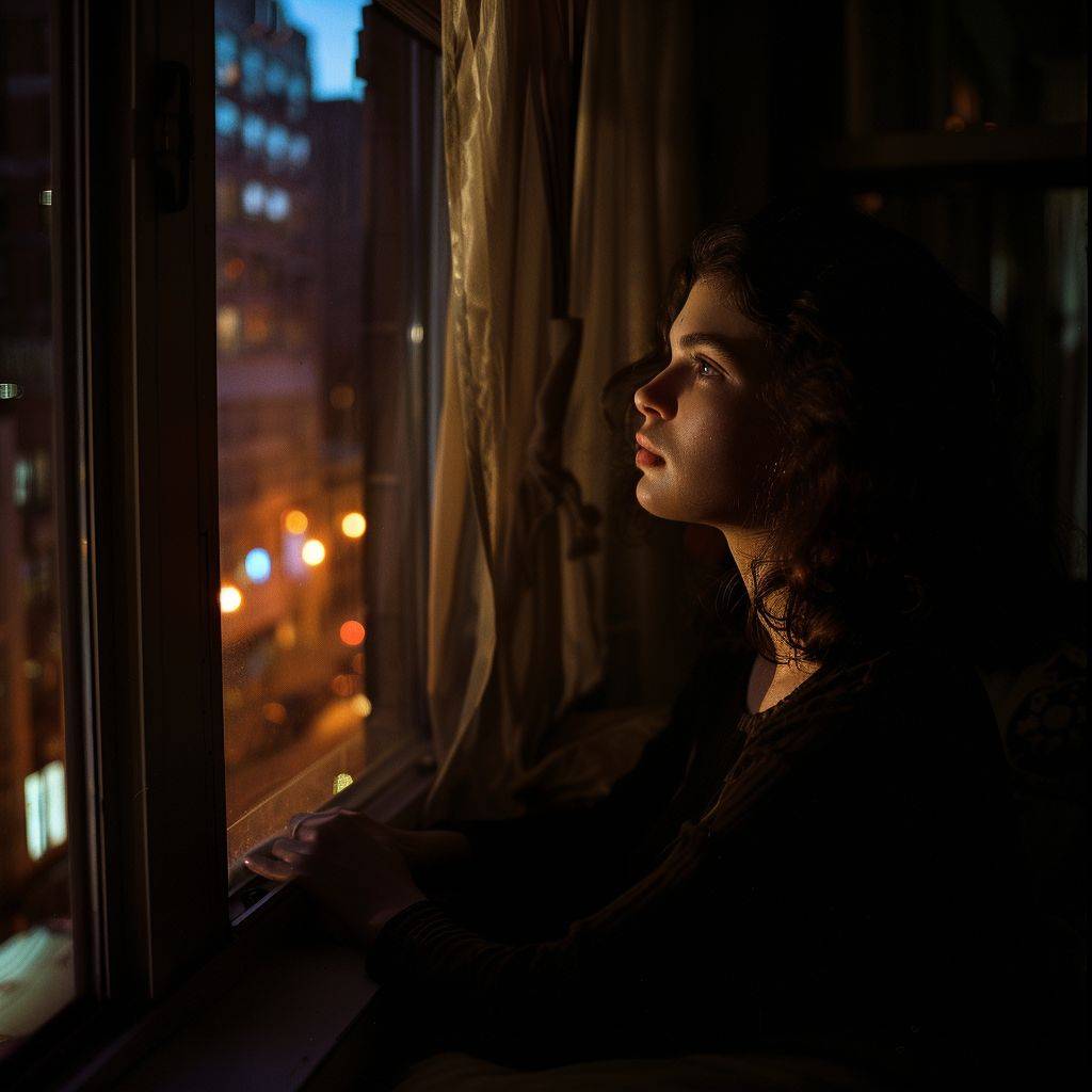 低调摄影,一个女孩透过她的房间窗户往外看,昏暗、温馨的城市公寓,从近景角度捕捉,强烈的对比,阴影,最小的光线,深黑色,阴郁的氛围,明暗对比,丰富的质感,细致的构图,使用35mm拍摄。