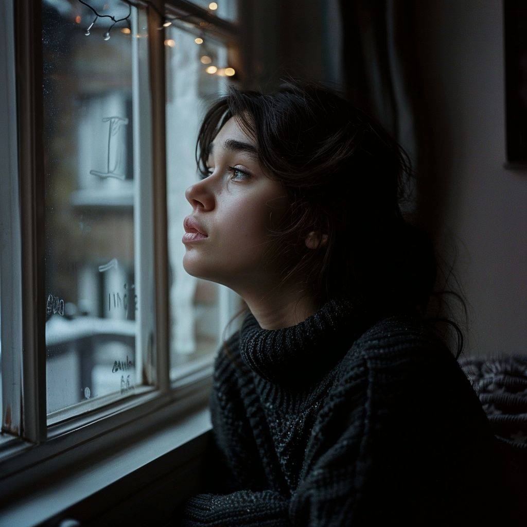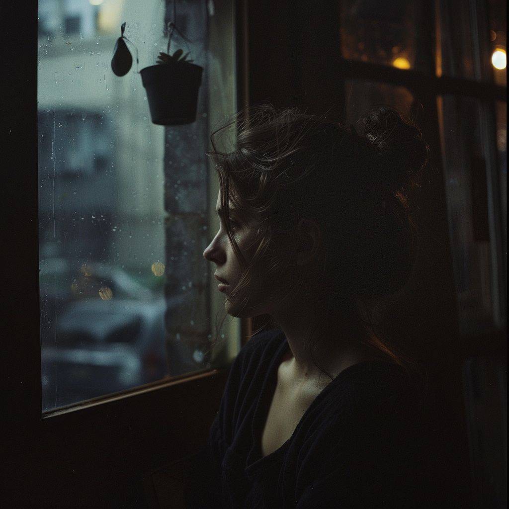 Low key photography, a girl looking out the window of her room, in a dimly lit, cozy urban apartment, from a close-up angle, intense contrast, shadows, minimal lighting, deep black, moody atmosphere, chiaroscuro, rich textures, detailed composition, taken in 35mm
