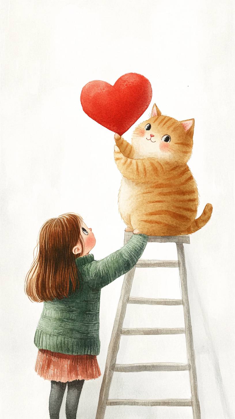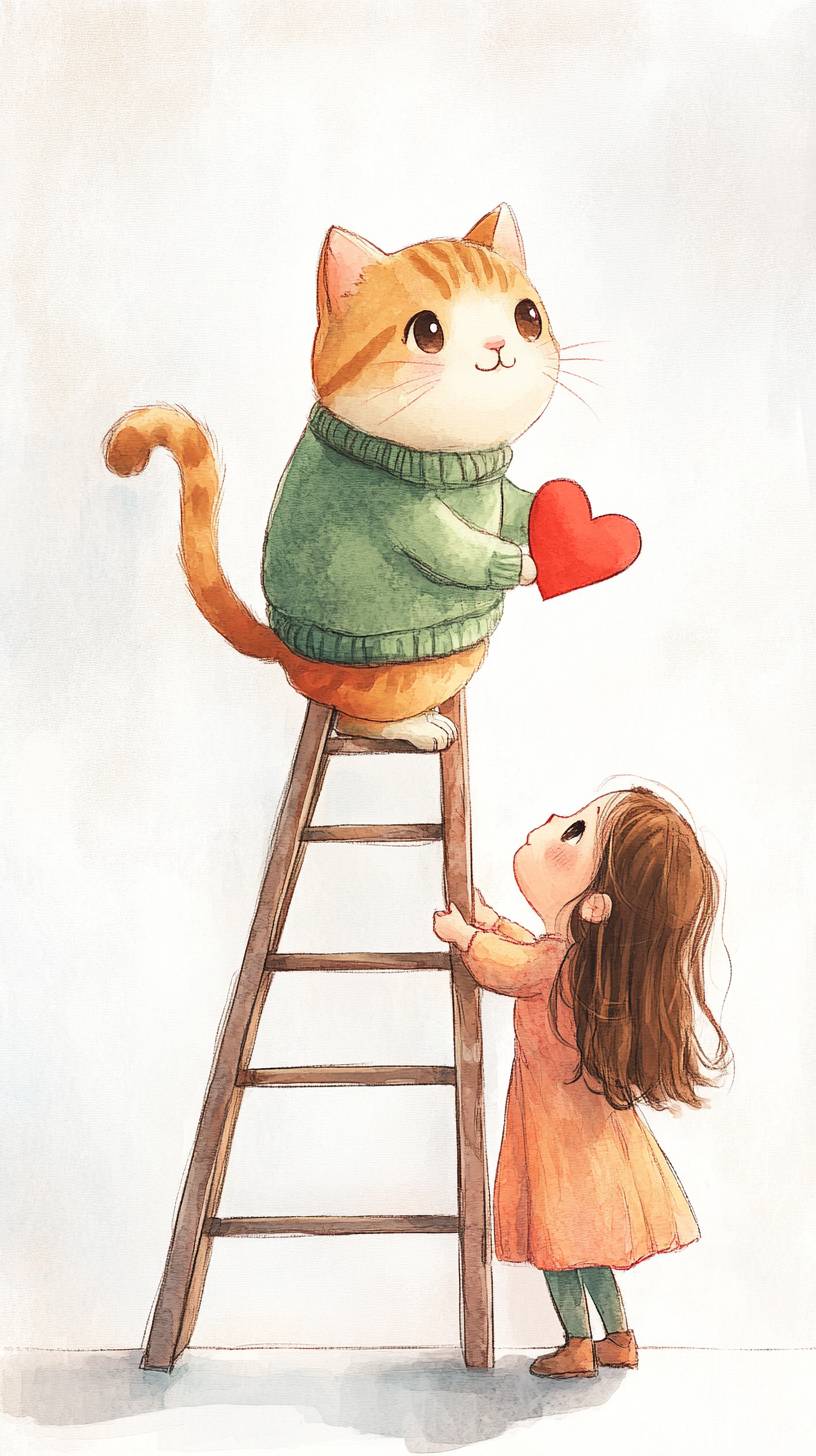 A cute, chubby cat is sitting on a ladder, wearing a green sweater and holding a red, heart-shaped paper in its paw to show love to a little girl standing below, looking up at the plump kitten with a smile and big eyes. The background of white walls creates an atmosphere full of romance and warmth. Illustration style, watercolor painting, warm colors, high-definition resolution, full-body portrait, soft lighting, warm tones, in the style of . --ar 9:16 --v 6.1