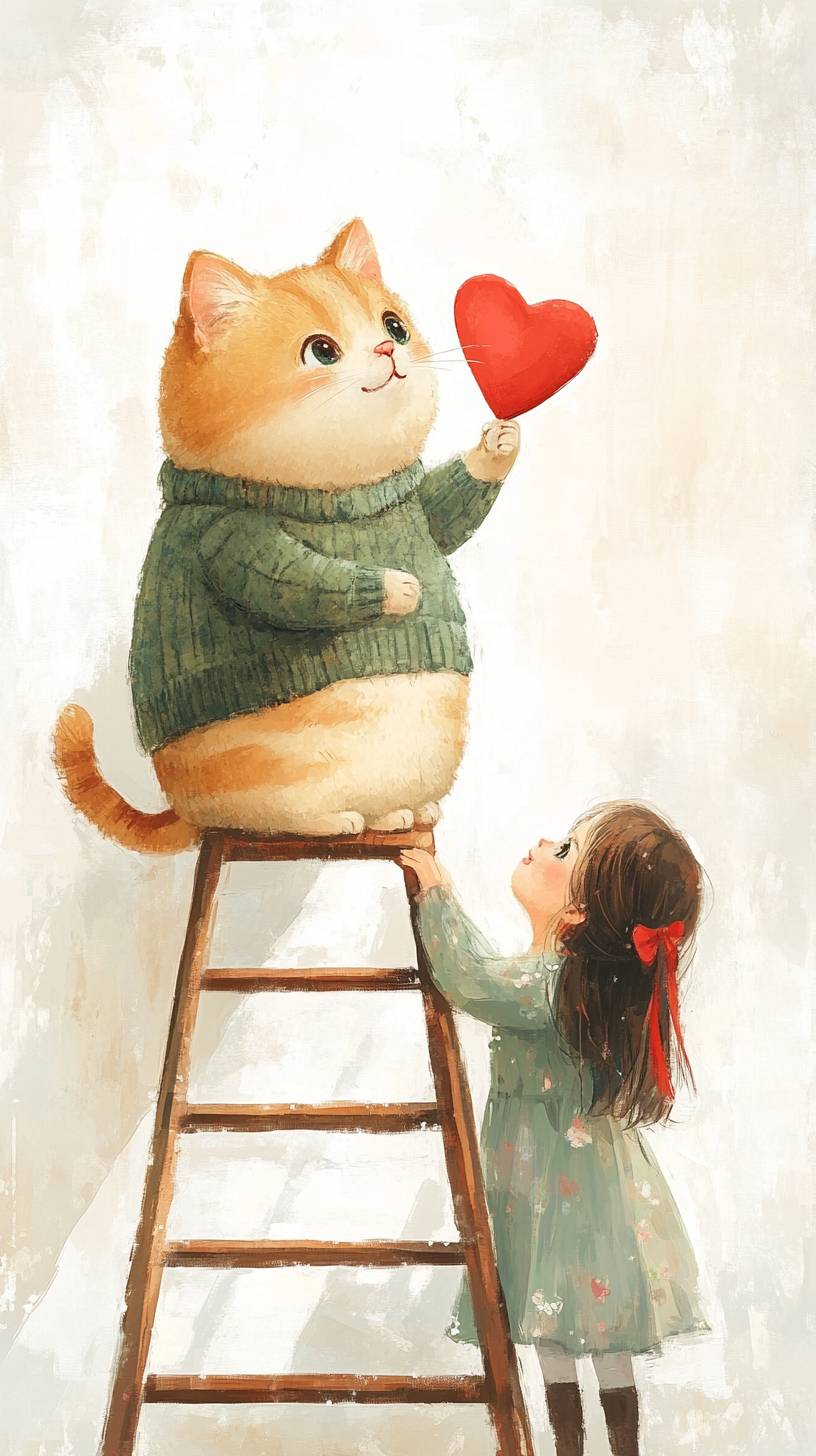 一只可爱、肥胖的猫坐在梯子上,穿着绿色毛衣,爪子里拿着一张红色心形纸,向站在下面的小女孩展示爱意。小女孩抬头微笑着看着这只圆胖的小猫,眼睛大大的。白色墙壁的背景营造出浪漫和温暖的氛围。插画风格,水彩画,暖色调,高分辨率,全身肖像,柔和的光线,暖色调。