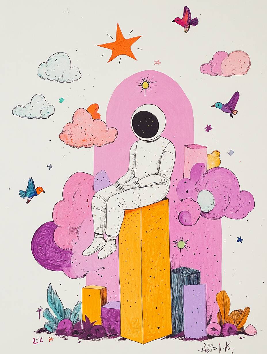 超现实场景,一个身影坐在几何形状上,星形的头顶,粉色和米色的色块作为背景,附近漂浮着抽象元素,没有面孔的身影,上方有云状形态,微小的五彩鸟类在飞翔,梦境般的冥想,空灵的沉思氛围。