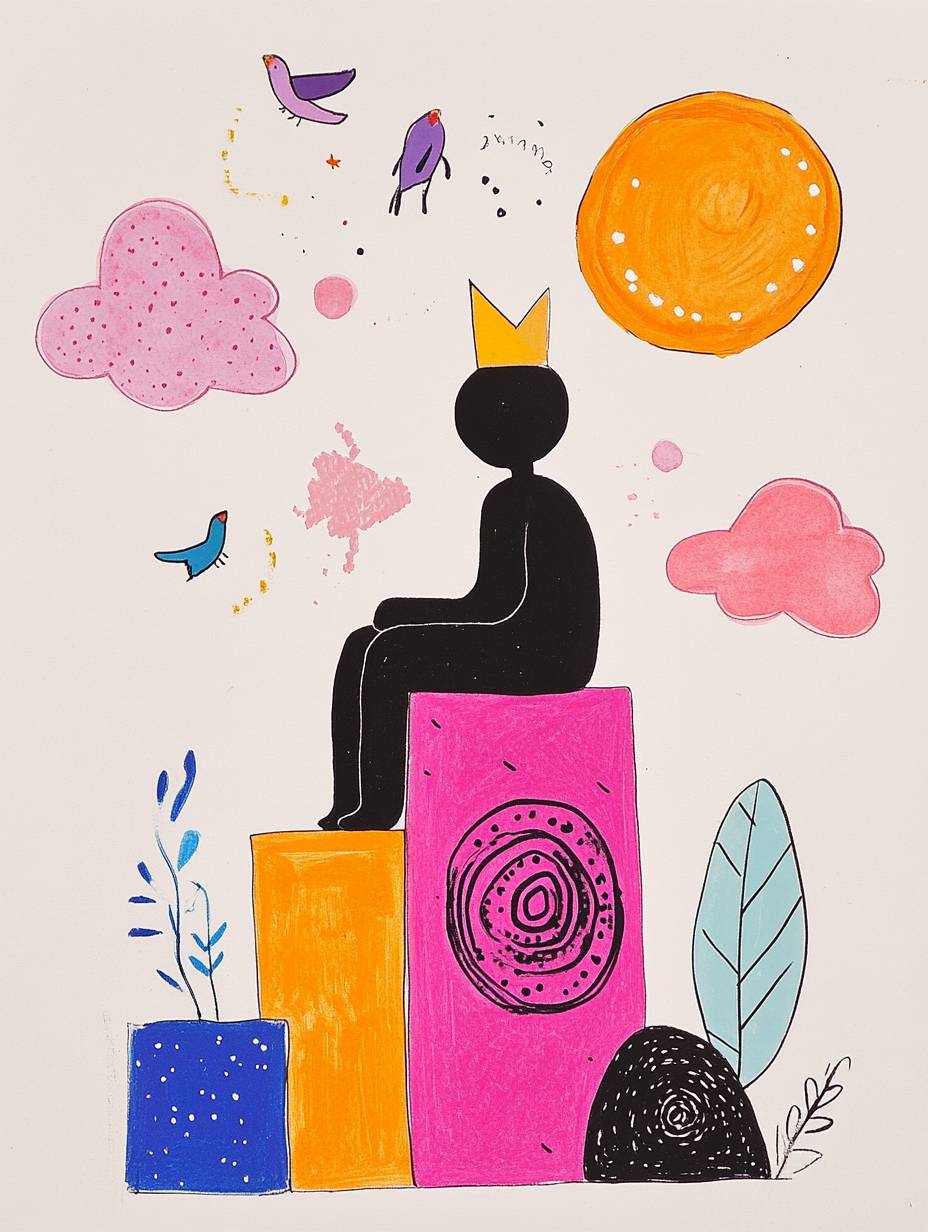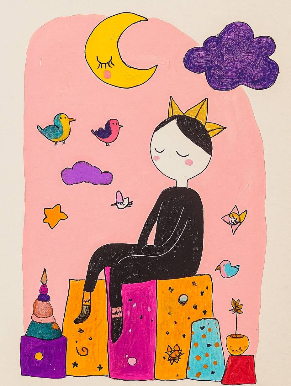 surreal scene with figure seated on geometric shape, star-topped head, pink and beige color blocks as background, abstract elements floating nearby, faceless figure, cloud-like forms above, tiny colorful birds in flight, dreamscape meditation, ethereal contemplative atmosphere, --ar 3:4 --style raw --sref 2947028143 --personalize rd9y55c --v 6.1